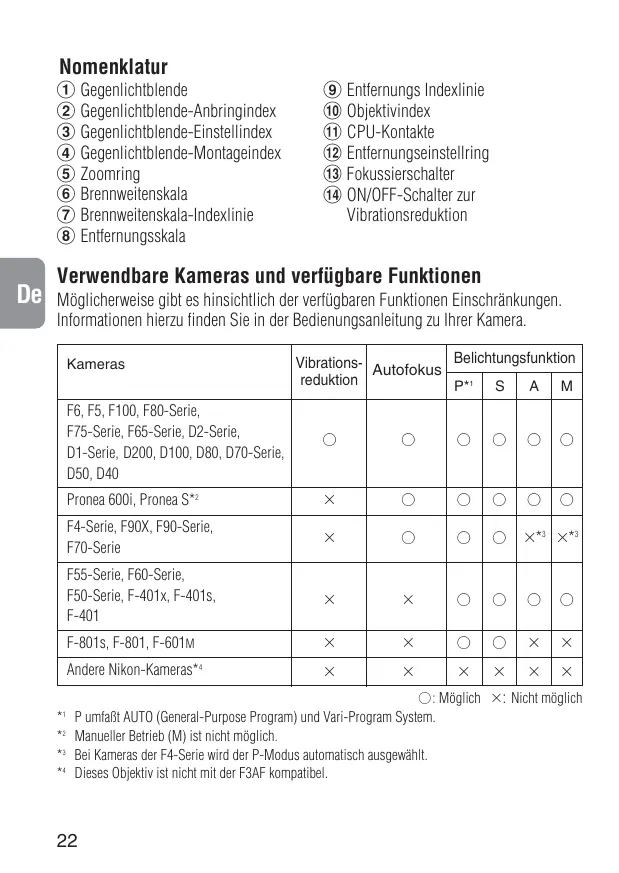 P umfaßt AUTO (General-Purpose Program) und Vari-Program System. Manueller Betrieb (M) ist nicht möglich. Bei Kameras der F4-Serie wird der P-Modus automatisch ausgewählt. Dieses Objektiv ist nicht mit der F3AF kompatibel.