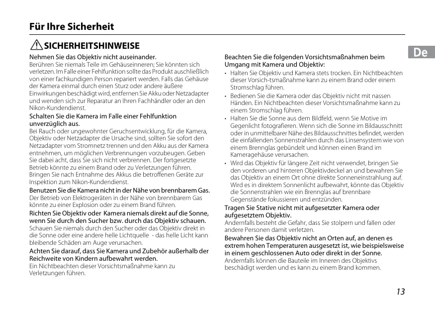 Für Ihre Sicherheit SICHERHEITSHINWEISE Nehmen Sie das Objektiv nicht auseinander. Berühren Sie niemals Teile im Gehäuseinneren; Sie könnten sich verletzen. Im Falle einer Fehlfunktion sollte das Produkt auschließlich von einer fachkundigen Person repariert werden. Falls das Gehäuse der Kamera einmal durch einen Sturz oder andere äußere Einwirkungen beschädigt wird, entfernen Sie Akku oder Netzadapter und wenden sich zur Reparatur an Ihren Fachhändler oder an den Nikon-Kundendienst. Schalten Sie die Kamera im Falle einer Fehlfunktion unverzüglich aus. Bei Rauch oder ungewohnter Geruchsentwicklung, für die Kamera, Objektiv oder Netzadapter die Ursache sind, sollten Sie sofort den Netzadapter vom Stromnetz trennen und den Akku aus der Kamera entnehmen, um möglichen Verbrennungen vorzubeugen. Geben Sie dabei acht, dass Sie sich nicht verbrennen. Der fortgesetzte Betrieb könnte zu einem Brand oder zu Verletzungen führen. Bringen Sie nach Entnahme des Akkus die betroffenen Geräte zur Inspektion zum Nikon-Kundendienst. Benutzen Sie die Kamera nicht in der Nähe von brennbarem Gas. Der Betrieb von Elektrogeräten in der Nähe von brennbarem Gas könnte zu einer Explosion oder zu einem Brand führen. Richten Sie Objektiv oder Kamera niemals direkt auf die Sonne, wenn Sie durch den Sucher bzw. durch das Objektiv schauen. Schauen Sie niemals durch den Sucher oder das Objektiv direkt in die Sonne oder eine andere helle Lichtquelle - das helle Licht kann bleibende Schäden am Auge verursachen. Achten Sie darauf, dass Sie Kamera und Zubehör außerhalb der Reichweite von Kindern aufbewahrt werden. Ein Nichtbeachten dieser Vorsichtsmaßnahme kann zu Verletzungen führen.