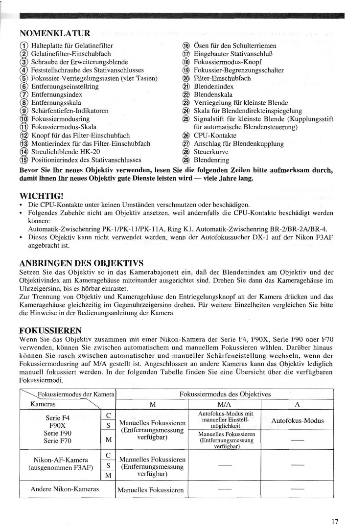 WICHTIG! • Die CPU-Kontakte unter keinen Umstanden verschmutzen oder beschadigen. • Folgendes Zubehbr nicht am Objektiv ansetzen, weil andernfalls die CPU-Kontakte beschadigt werden konnen: Automatik-Zwischenring PK-1/PK-11/PK-11A, Ring Kl, Automatik-Zwischenring BR-2/BR-2A/BR-4. • Dieses Objektiv kann nicht verwendet werden, wenn der Autofokussucher DX-1 auf der Nikon F3AF angebracht ist. '