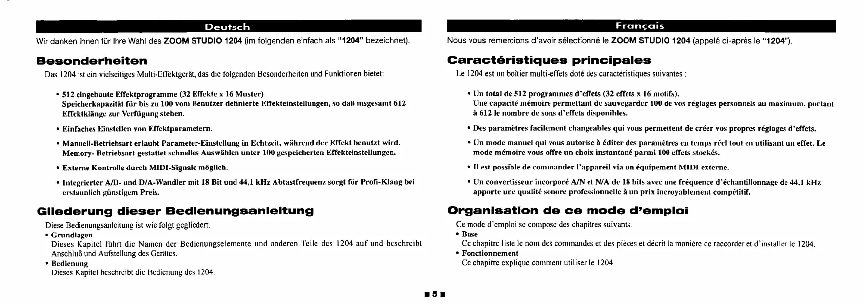 Wir danken lhnen fijr lhre Wahl d e s ZOOM STUDIO I204 (im foigenden einfach als "1204" bezeichnet). Nous v o u s remercions d'avoir selectionne le ZOOM STUDIO 1204 (appele ci-apr8s le "1204"). Besonderheiten Caract6ristiques principales Das 1204 ist ein vielscitigcs Multi-Effektgerat, das die folgenden Besonderheitcn und Funktionen bietet: Le 1204 est un boitier multieffets dote des caracteristiques suivantes : 512 eingebaute Effektprogranlnle (32 Effekte X 16 Muster) Speicherkapazitat fur bis zu 100 vonl Benutzer definierte Effekteinstellungen, so dall inqgesamt 612 Effektkliinge zur Verfugung stehen. Un total de 512 programmes d'effets (32 effets X 16 motifs). Une capacitc! nd~iloirepermettnnt de sauvegarder 100 de vos riglages personnels au ~ninimum,portant a 612 le nombre de sons d'effeb disponihles. Einfaches Einstellen von Ilffektparametern. Des p a r a m k t m facilement changeables qui vous permettent de cr6er vos propres riglages d'effets. Manuell-Retriebsart erlaubt Parameter-Einstellung in Echtzeit, wiihrend der Effekt benubt wird. Memory- Retriebsart gestattet schnelles Auswahlen unter 100 gespeicherten Effekteinstellungen. Un mode manuel qui vous autorise h iditer des pararnetres en temps r0cl tout en utilisant un effet. Le mode mbmoire vow offre un chok instantand yarmi 100 cffcts stockb. Externe Kontrolle durch MIDI-Signale moglich. II est possible de c o ~ ~ m a n dI'appareil via un 6quipement MIDI externe. Integrierter AID- und DIA-Wandler mit l 8 Bit und 441 kHz Abtastfrequenz sorgt fiir Profi-Klang bei erstaunlich gunstigem Preis. Un convertisseur incorpor6 A/N et NIA de 18 bits avec une frdquence d'dchantillonnage dc 44,l kHz apportc unc qualitg sonon. professionnelle a un prix incroyablemer~lcomp0titif. Gliederung dieser Bedlenungsanleitung Diese Bedienungsanlcitung ist wie folgt gegliedert. Grundlagen Dieses Kapitel ftlhrt die Namen der Bedienungsclemcntc und andercn l'eilc des 1204 auf und beschreibt AnschluD und Aufstellung dcs Gcratcs. Bedienung Ilicscs Kapitel beschreibt die Hedienung des 1204. Organisation de ce mode d9emploi Ce mode d'cmploi sc composc des chapitres suivants. Base Cc chapitrc liste Ic non1 des con~mandeset des piices et decrit la manicre de raccorder et d'installer le 1204. Fonctionnement Cc chapitrc cxpliquc comment utiliser le 1204. Effekttypen, Effektmuster, Effektparameter Dieses Kapitel beschreibt die vertilgbaren Effckttypen, Effcktnluster und Effektparameter. Wichtige Inforniationen Dieses Kapitel enthlilt I-Iinweise zur Stsrungshilfe sowie Vorsichtsmd3regeln. Wenn Sie den 1204 z u m ersten Mal benutzen (1) 1,esen Sie zuerst den Ahschnitt "Vorsichtsniallregeln" ini Kapitel "Wichtige Informationen". (2) Schliellen Sie den 1204 an, wie im Kapitel "Grundhgen" beschrieben. (3) Probieren Sie die verschiedenen Effekte aus. Ziehen Sie hierbei das Kapitel "Bedienung" zu Rate. (4) Wenn Sie Effekte editieren niochten, uni Ihren eigenen Sound zu kreieren, beachten Sie die Angaben im Kapitel "Effekttypen, Kffektniaster, Effektparameter". H Wenn eine Storung vorliegt Wcnn das 1204 nicht korrckt zu funktionieren scheint, lesen Sie den Abschnitt "StZ)rungshilfe" im Kapilel "Wicl~tigeInformationen". Bitte lesen Sie diese Bedienungsanleitung sorgfaltig durch, urn sich mit den vielfaltigen Funktionen des Gerates vertraut zu machen. Damit stellen Sie sicher, daO Sie das 1204 optimal nutzen und uber viele Jahre hinweg an diesern GerAt Freude haben. Bewahren Sie die Bedienungsanleitung, Garantiekarte und alle anderen Unterlagen gut auf. Types d'effets, motifs d'effets, parametres d'effets Ce chapitrc ddcrit les differcuts types d'effets, de motifs d'eflets et de paranlctrcs d'effets. Renseignenients importants Ce chapitre comprend les prkcautions de sCcuritt et les nlesures a adopter en cas de paines. Lorsque vous utilisez le 1204 pour la premiere fois (1)Lisez tout d'abord la section "PrCcautions de s6curitd" dam le cliapitre "Renseigncmmts importants". (2) Reportez-vous au chapitre "Base" pour raccorder et installer votre 1204. (3) Reportez-vous au chapitre "Fonctionnement" pour essayer les diff6rents effets. (4) Lorsque vous souhaitez editer des effets pour cr6er vos sons propres, rifdrez-vous au chapitre '"Qpes d'effets, motifs d'effets, parandtres d'effets". H En cas de problgme Si le 1204 semble ne pas fonctionner correctcmcnt, reportez-vow A la section "DCpistagc des pannes" dam le chapitre "Renseibmements importants". Veuillez prendre le temps de lire attentivement ce mode d'emploi afin d'exploiter au rnieux votre 1204 et de garantir une performance et une fiabilite maximales. Conservez ce mode d'emploi, la carte de garantie et toutes les autres documentations pour vous y referer ulterieurernent. Diese Bedienungsanleitung enthdt wichtige Warnungen und Hinweise, die darauf abziclen. Verletzungen und Sachschaden zu verrneiden. Die Hinweise sind mit besonderen Symbolen gekennzeichnet, deren Bedeutung nachstehend erklm ist. Lesen Sie diese Stellen bitte besonders gut durch und befolgen Sie alle Angaben. /I\ Dicses Symbol kennzeichnet besonders wichtige Erklarungen zu mdglichen Gefahrenquellen. Wenn diese Warnungen ignoriert werden und das Gerat in falscher Weise benutzt wird. kann es zu schweren Verletzungen oder Todesfdl kommen. Les renseignements importants compris dam ce modc d'emploi, qui ont pour objct d'tviter le danger de blessures corporelles et I'endommagement de I'tquipement, sont signales par des symboles particuliers. La signification de ces symboles est expliquee ci-dcssous. Veuillez lire ces renseignements soigneusement et observer toutes les precautions et instructions.