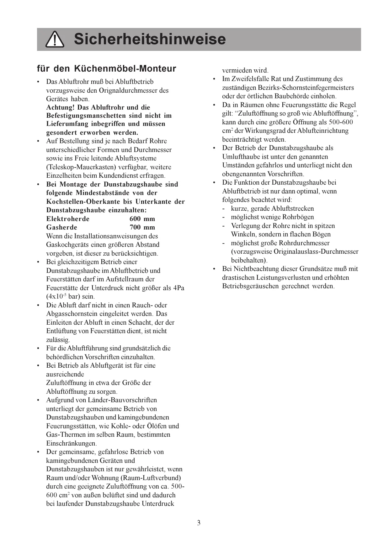 - Der gemeinsame, gefährlose Betrieb von kamingebundenen Geräten und Dunstabzugshauben ist nur gewährleistet, wenn Raum und/oder Wohnung (Raum-Luftverbund) durch eine geeignete Zuluftöffnung von ca. 500-600 cm² von außen beluftet sind und dadurch bei laufender Dunstabzugshaube Unterdruck