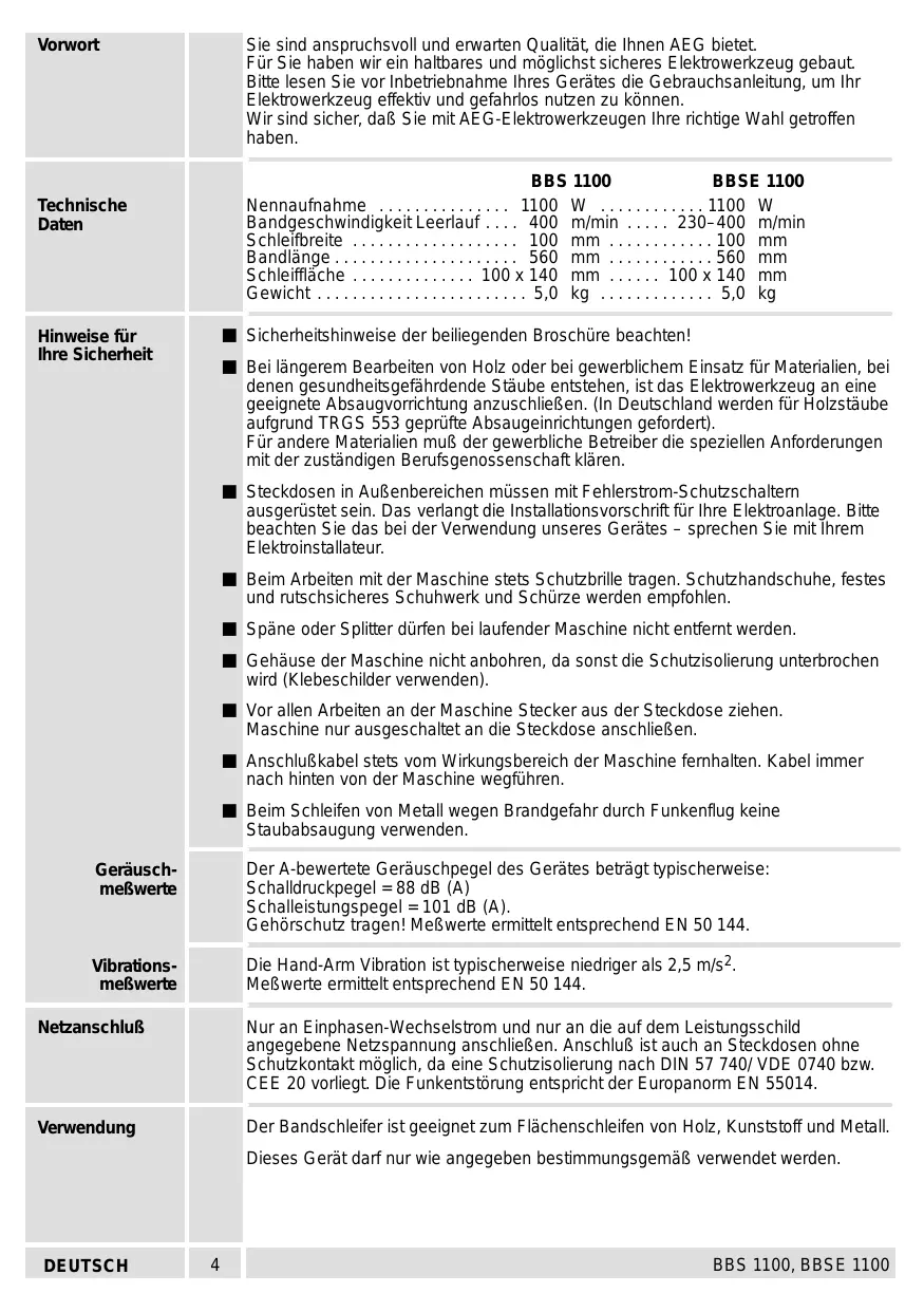 Vorwort Technische Daten Hinweise für Ihre Sicherheit Geräusch- mefwerte Vibrations- mefwerte Netzanschlu& Verwendung DEUTSCH Sie sind anspruchsvoll und enwarten Qualität, die Ihnen AEG bietet. Für Sie haben wir ein haltbares und môglichst sicheres Elektrowerkzeug gebaut. Bitte lesen Sie vor Inbetriebnahme Ihres Gerètes die Gebrauchsanleitung, um Ihr Elektowerkzeug effeküiv und gefahrlos nutzen zu Kônnen. Wir sind sicher, daB Sie mit AË G-Elektrowerkzeugen Ihre richtige Wahl getroffen haben. BBS 1100 BBSE 1100 Nennaufnahme 1100 W Bandgeschwindigkeit Leeriauf .230- Et m/min Schleïfbreite … Bandlänge Schleifläche : Gewicht