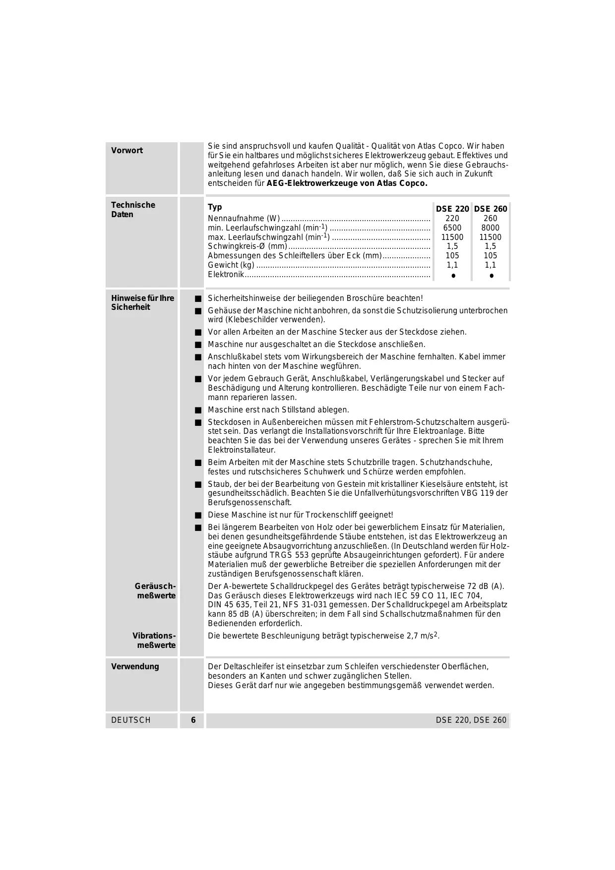 Vorwort Technische Daten Sicherheit Geräusch- mefRwerte Vibrations- mefRwerte Verwendung DEUTSCH Sie sind anspruchsvoll und kaufen Qualität - Qualität von Atlas Copco. Wir haben fürSie ein haltbares und mêglichstsicheres Elektrowerkzeug gebaut.E ffektives und weitgehend gefahrloses Arbeiten ist aber nur mêglich, wenn Sie diese Gebrauchs- anleïtung lesen und danach handeln. Wir wollen, daB Sie sich auch in Zukunft entscheiden für AEG-Elektrowerkzeuge von Atlas Copco. Typ DSE 220 DSE 260 Nennaufnahme (W) … 220 260 min. Leerlaufschwingzahl (min-1) . 6500 | 8000 max. Leerlaufschwingzahl (min-) 11500 | 11500 Schwingkreis-@ (mm). 1,5 1,5 Abmessungen des Schleiftellers über Eck (mm)... 105 105 Gewicht (kg) … 11 11 Elektronik.…. . . Sicherheitshinweise der beiliegenden Broschüre beachten! Gehäuse der Maschine nichtanbohren, da sonstdie Schutzisolierung unterbrochen wird (Klebeschilder verwenden). Vor allen Arbeiten an der Maschine Stecker aus der Steckdose ziehen. Maschine nur ausgeschaltet an die Steckdose anschlieBen. AnschluBkabel stets vom Wirkungsbereich der Maschine femhalten. Kabel immer nach hinten von der Maschine wegführen. Vor jedem Gebrauch Gerät, Anschlukabel, Verlängerungskabel und Stecker auf Beschädigung und Alterung kontrollieren. Beschädigte Telle nur von einem Fach- mann reparieren lassen Maschine erst nach Stillstand ablegen. Steckdosen in AuBenbereichen müssen mit Fehlerstrom-Schutzschaltem ausgerü- stet sein. Das verlangt die Installationsvorschrift für Ihre Elektroanlage. Bitte beachten Sie das bei der Verwendung unseres Gerâtes - sprechen Sie mit Inrem Elektroinstallateur. Beim Arbeiten mit der Maschine stets Schutzbrille tragen. Schutzhandschuhe, festes und rutschsicheres Schuhwerk und Schürze werden empfohlen. Staub, der bei der Bearbeitung von Gestein mit kristalliner Kieselsäure entsteht, ist gesundheitsschädlich. Beachten Sie die Unfallverhütungsvorschrifien VBG 119 der Berufsgenossenschaft. Diese Maschine ist nur für Trockenschliff geeignet! Bei längerem Bearbeiten von Holz oder bei gewerblichem Einsatz für Materialien, bei denen gesundheitsgefährdende Stäube entstehen, ist das Elektrowerkzeug an eine geeignete Absaugvorrichtung anzuschlieBen. (In Deutschland werden für Holz- stäube aufgrund TRGS 553 geprüfte Absaugeinrichtungen gefordert). F ür andere Materialien muB der gewerbliche Betreiber die speziellen Anforderungen mit der zuständigen Berufsgenossenschaft kiären. Der A-bewertete S challdruckpegel des Gerätes beträgt typischerweise 72 dB (A). Das Geräusch dieses Elektrowerkzeugs wird nach IEC 59 CO 11, IEC 704, DIN 45 635, Teil 21, NFS 31-031 gemessen. Der Schalldruckpegel am Arbeitsplatz kann 85 dB (A) überschreiten: in dem Fall sind S challschutzmaBnahmen für den Bedienenden erforderiich Die bewertete Beschleunigung beträgt typischerweise 2,7 m/s2 Der Deltaschleïfer ist einsetzbar zum Schleifen verschiedenster Oberfiächen, besonders an Kanten und schwer zugänglichen Stellen. Dieses Gerët darf nur wie angegeben bestmmungsgemëB venwendet werden: DSE 220, DSE 260