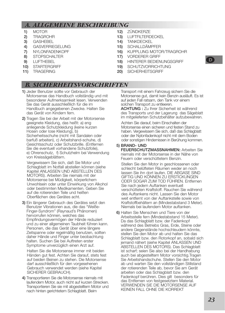 ANGEBRACHE SCHUTZVORRICHTUNG (siehe Kapitel SICHERER GEBRAUCH und MONTAGE VON SCHLAGBLATT UND NYLONFADENKOPF). Die Nichtbeachtung dieser Vorschriften kann zu gefährlichen Situationen führen wie a) Kontakt mit den rotierenden und scharfen Teilen,b) Hochschleudern verschiedener Gegenstände.