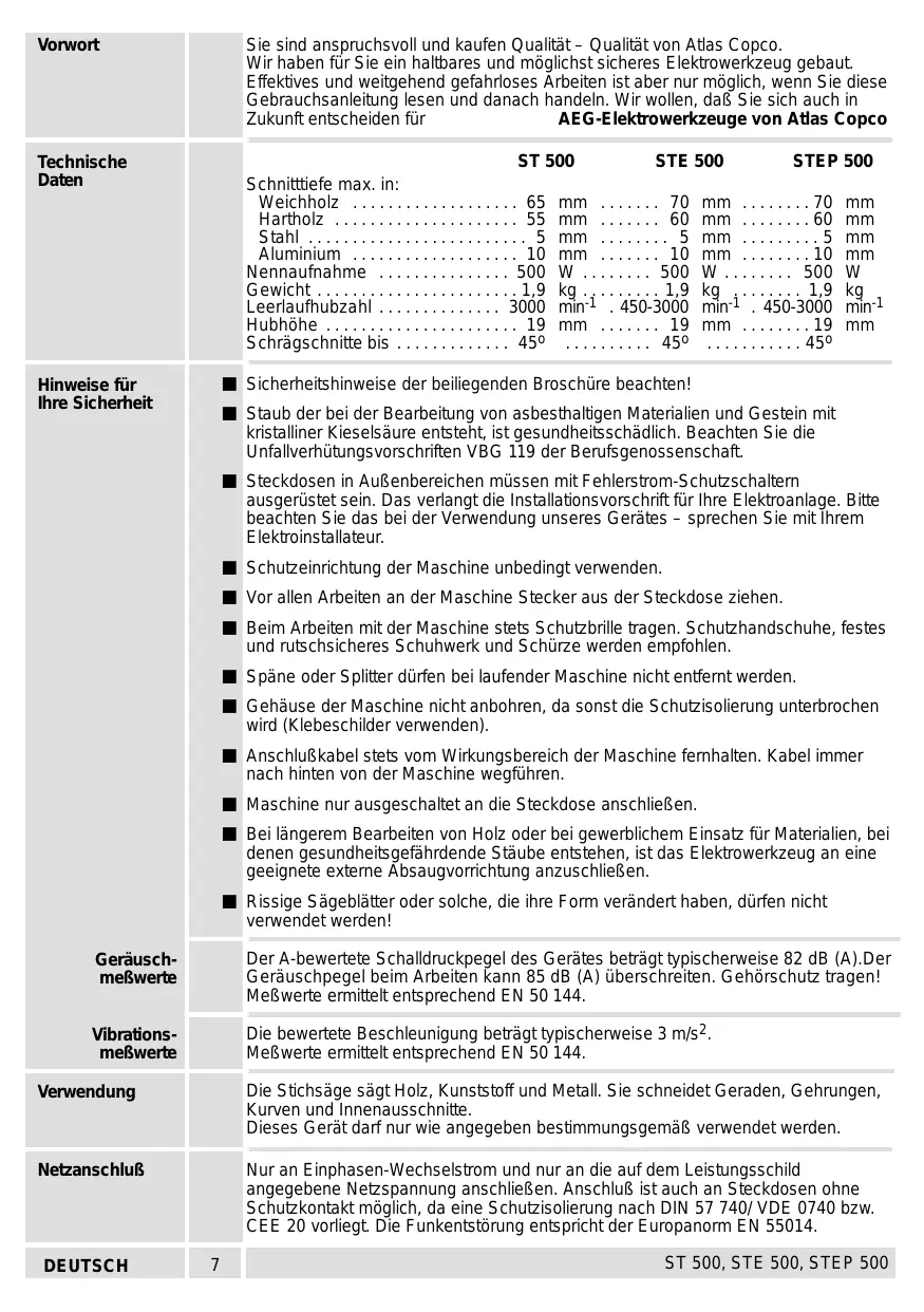 - Vorwort Sie sind anspruchsvoll und kaufen Qualität – Qualität von Atlas Copco. Wir haben für Sie ein haltbares und möglichst sicheres Elektrowerkzeug gebaut. Effektives und weitgehend gefahrloses Arbeiten ist aber nur möglich, wenn Sie diese Gebrauchsanleitung lesen und danach handeln. Wir wollen, daß Sie sich auch in Zukunft entscheiden für AEG-Elektrowerkzeuge von Atlas Copco Technische Daten ST 500 STE 500 STEP 500 Schnitttiefe max. in: Weichholz p. 65