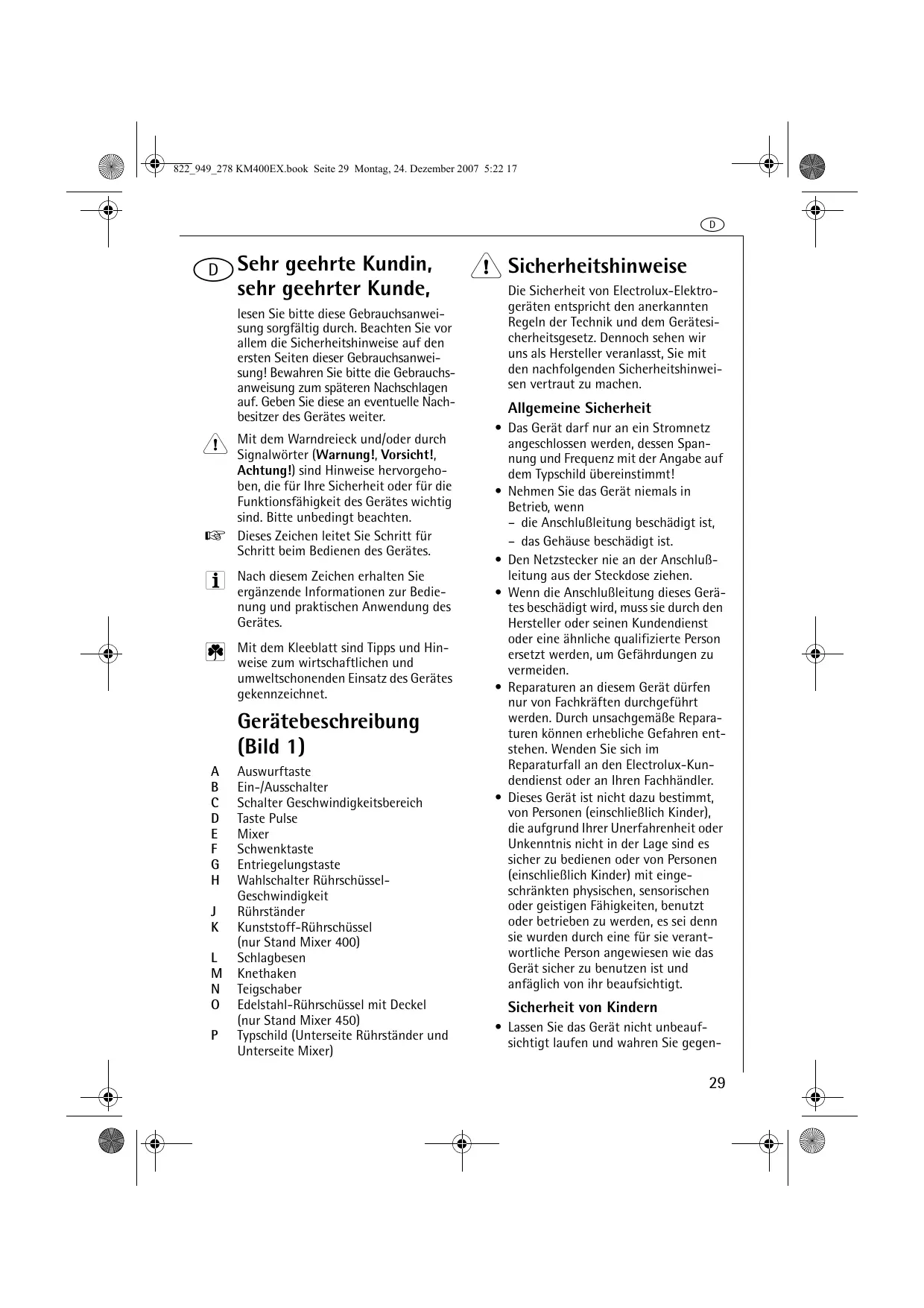 Die Sicherheit von Electrolux-Elektrageraten entspricht den anerkannten Regeln der Technik und dem Gerätesicherheitsgesetz. Dennoch sehen wir uns als Hersteller veranlasst, Sie mit den nachfolgenden Sicherheitshinweisen vertraut zu machen.