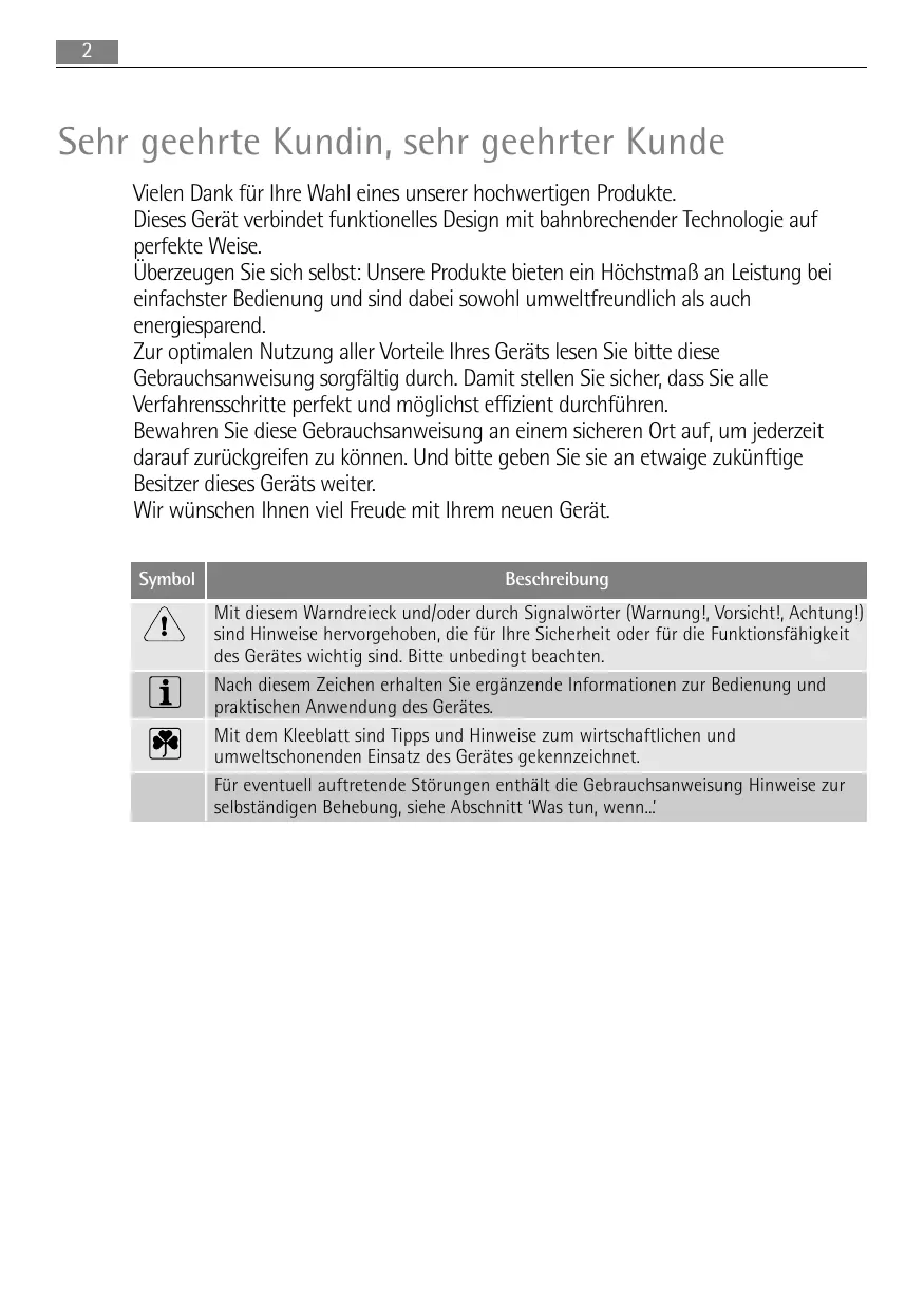 Sehr geehrte Kundin, sehr geehrter Kunde Vielen Dank für Ihre Wahl eines unserer hochwertigen Produkte. Dieses Gerät verbindet funktionelles Design mit bahnbrechender Technologie auf perfekte Weise. Überzeugen Sie sich selbst: Unsere Produkte bieten ein Höchstmaß an Leistung bei einfachster Bedienung und sind dabei sowohl umweltfreundlich als auch energiesparend. Zur optimalen Nutzung aller Vorteile Ihres Geräts lesen Sie bitte diese Gebrauchsanweisung sorgfältig durch. Damit stellen Sie sicher, dass Sie alle Verfahrensschritte perfekt und möglichst effizient durchführen. Bewahren Sie diese Gebrauchsanweisung an einem sicheren Ort auf, um jederzeit darauf zurückgreifen zu können. Und bitte geben Sie sie an etwaige zukünftige Besitzer dieses Geräts weiter. Wir wünschen Ihnen viel Freude mit Ihrem neuen Gerät. Symbol Beschreibung Mit diesem Warndreieck und/oder durch Signalwörter (Warnung!, Vorsicht!, Achtung!) sind Hinweise hervorgehoben, die für Ihre Sicherheit oder für die Funktionsfähigkeit des Gerätes wichtig sind. Bitte unbedingt beachten. Nach diesem Zeichen erhalten Sie ergänzende Informationen zur Bedienung und praktischen Anwendung des Gerätes. Mit dem Kleeblatt sind Tipps und Hinweise zum wirtschaftlichen und umweltschonenden Einsatz des Gerätes gekennzeichnet. Für eventuell auftretende Störungen enthält die Gebrauchsanweisung Hinweise zur selbständigen Behebung, siehe Abschnitt ‘Was tun, wenn...’ Inhalt