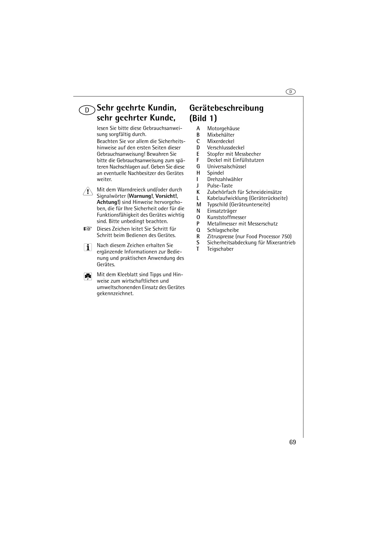 - Mixer oder Universalschüssel können nur dann in Betrieb genommen werden, wenn der jeweilige Behälter und der zugehörige Deckel richtig eingesetzt sind.