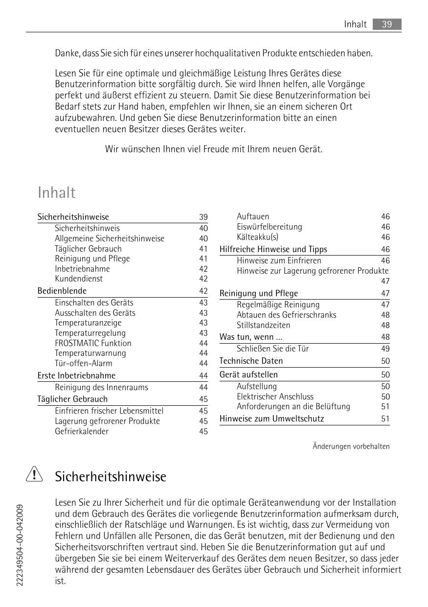 Auftauen Eiswürfelbereitung Kälteakku(s) Hilfreiche Hinweise und Tipps Hinweise zum Einfrieren Hinweise zur Lagerung gefrorener Produkte Reinigung und Pflege Regelmäßige Reinigung Abtauen des Gefrierschranks Stillstandzeiten Was tun, wenn … Schließen Sie die Tür Technische Daten Gerät aufstellen Aufstellung Elektrischer Anschluss Anforderungen an die Belüftung Hinweise zum Umweltschutz Änderungen vorbehalten 222349504-00-042009 Sicherheitshinweise Lesen Sie zu Ihrer Sicherheit und für die optimale Geräteanwendung vor der Installation und dem Gebrauch des Gerätes die vorliegende Benutzerinformation aufmerksam durch, einschließlich der Ratschläge und Warnungen. Es ist wichtig, dass zur Vermeidung von Fehlern und Unfällen alle Personen, die das Gerät benutzen, mit der Bedienung und den Sicherheitsvorschriften vertraut sind. Heben Sie die Benutzerinformation gut auf und übergeben Sie sie bei einem Weiterverkauf des Gerätes dem neuen Besitzer, so dass jeder während der gesamten Lebensdauer des Gerätes über Gebrauch und Sicherheit informiert ist.