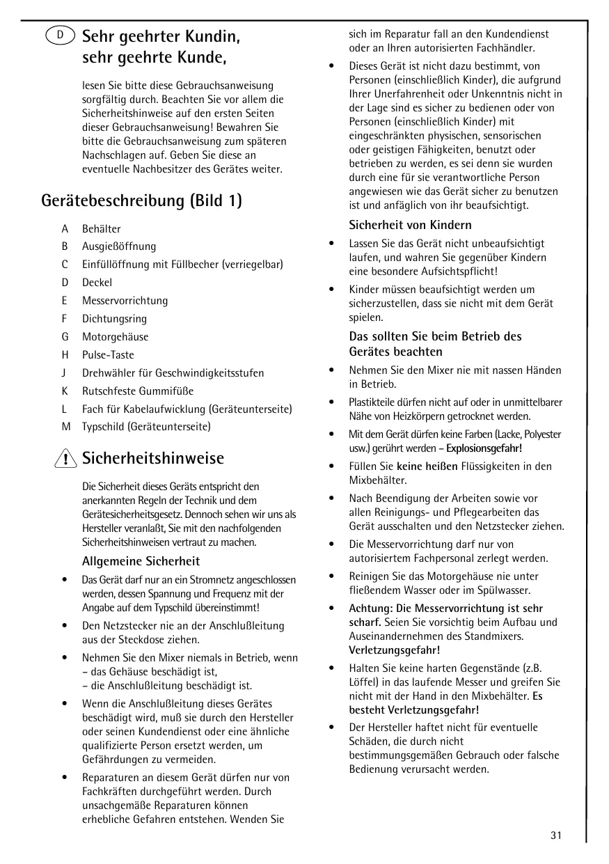 - EM C Norm 89 /336/EEC und Ergänzung 9 2/31/EEC sow ie 9 3/68/EEC Te ch nisch e D ate n Ne tzspannung: 230/240 V Le istungsaufnah m e : 500 W Anw e ndungsbe ispie l D e r Standm ixe r die nt zur Z ube re itung ve rsch ie de nste r M ixge tränk e , zum Z e rstoße n von Eis, Z e rk l e ine rn von Früch te n und Ge m üse , Sah ne sch l age n usw . K abe l fach (Bil d 2) D as Ge rät be sitzt e in K abe l fach . Fal s die Z ul e itung zur Ste ck dose zu l ang ist, k önne n Sie nich t be nötigte s K abe lim Ge h äuse bode n unte rbringe n. Ge rät ause inande rne h m e n Ne tzste ck e r zie h e n. Be h äl te r im Uh rze ige rsinn dre h e n und abne h m e n (Bil d 3). D re h e n Sie m ith il fe de s M e ssbe ch e rs die M e sse rvorrich tung ge ge n de n Uh rze ige rsinn h e raus. D ie Nute n de s M e ssbe ch e rs passe n in die Rippe n de r M e sse rgruppe (Bil d 4). Ach tung: D ie M e sse rvorrich tung ist se h r sch arf. Es be ste h t Ve rl e tzungsge fah r! Ach tung: D ie M e sse rvorrich tung nich t m it Ge w al t aus de m M ixbe h äl te r e ntne h m e n, da die se sonst be sch ädigt w e rde n k önnte ! M e sse rvorrich tung be im Entne h m e n ggf. e ich t sch räg h al te n. Se tze n Sie de n D ich tungsring auf die M e sse rvorrich tung (Bil d 5). Se tze n Sie die M e sse rvorrich tung e in, und h al te n Sie dabe i de n M ixe r nach unte n. Sch rauben Sie die M esservorrich tung m ith il des M essbech ers im Uh rzeigersinn fest (Bil d 6). Vorsich t! Vorsich tig h andh abe n! Se tze n Sie de n Be h äl te r auf das M otorge h äuse und dre h e n Sie ih n e ntge ge n de n Uh rze ige rsinn bis zum Ansch l ag. Be ide Pfe il e m üsse n übe re inande r ste h e n (Bil d 7). Se tze n Sie de n D e ck e lauf de n Be h äl te r und dre h e n Sie ih n, bis die Nase de s D e ck e l s dire k t übe r de m Griff ste h t (Bil d 8). D ank de m 2- W e g- Sich e rh e itssyste m l äßt sich de r Standm ixe r nur be die ne n, w e nn de r Be h äl te r und de r D e ck e lrich tig sitze n (Bil de r 7 und 8). Sie h e auch de n Absch nitt „Z w e ifach Sich e rh e its- syste m “. Se tze n Sie de n Fül be ch e r (Bil d 1/C) e in und ve rrie ge l n Sie ih n. Be die ne n de s Standm ixe rs Ste l e n Sie de n Standm ixe r auf e ine e be ne und trock e ne Arbe itsfl äch e . Öffne n Sie de n D e ck e l(Bil d 1/D ) und ge be n Sie al e be nötigte n Z utate n in de n Be h äl te r. Ach tung: M axim al e Fül m e nge von 1,5 Lite r nich t übe rsch re ite n! W äh re nd de s Be trie be s k önne n Sie w e ite re Z utate n durch die Einfül öffnung h inzuge be n. Sie k önne n h ie rfür auch de n Fül be ch e r im D e ck e l(Bil d 1/C) ve rw e nde n. Sch l ie ße n Sie die Ein- fül öffnung je w e il s w ie de r sofort, um Spritze r zu ve rm e ide n. Starte n Sie de n Standm ixe r, inde m Sie de n D re h w äh l e r (Bil d 1/J) nach re ch ts dre h e n ode r die Pul se - Taste (Bil d 1/H ) drück e n. Es e m pfie h l t sich , m it Ge sch w indigk e itsstufe 1 zu be ginne n und dann zur Stufe 2 übe rzuge h e n. D urch D rück e n de r Pul se - Taste äuft de r Standm ixe r m it h öch ste r Ge sch w indigk e it.