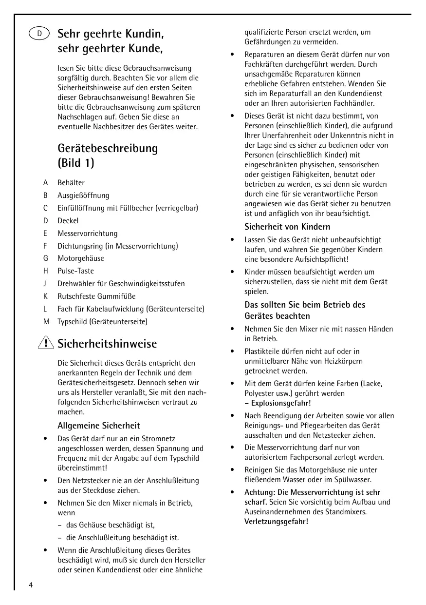 i Stellen Sie den Standmixer auf eine ebene und trockene Arbeitsflache.