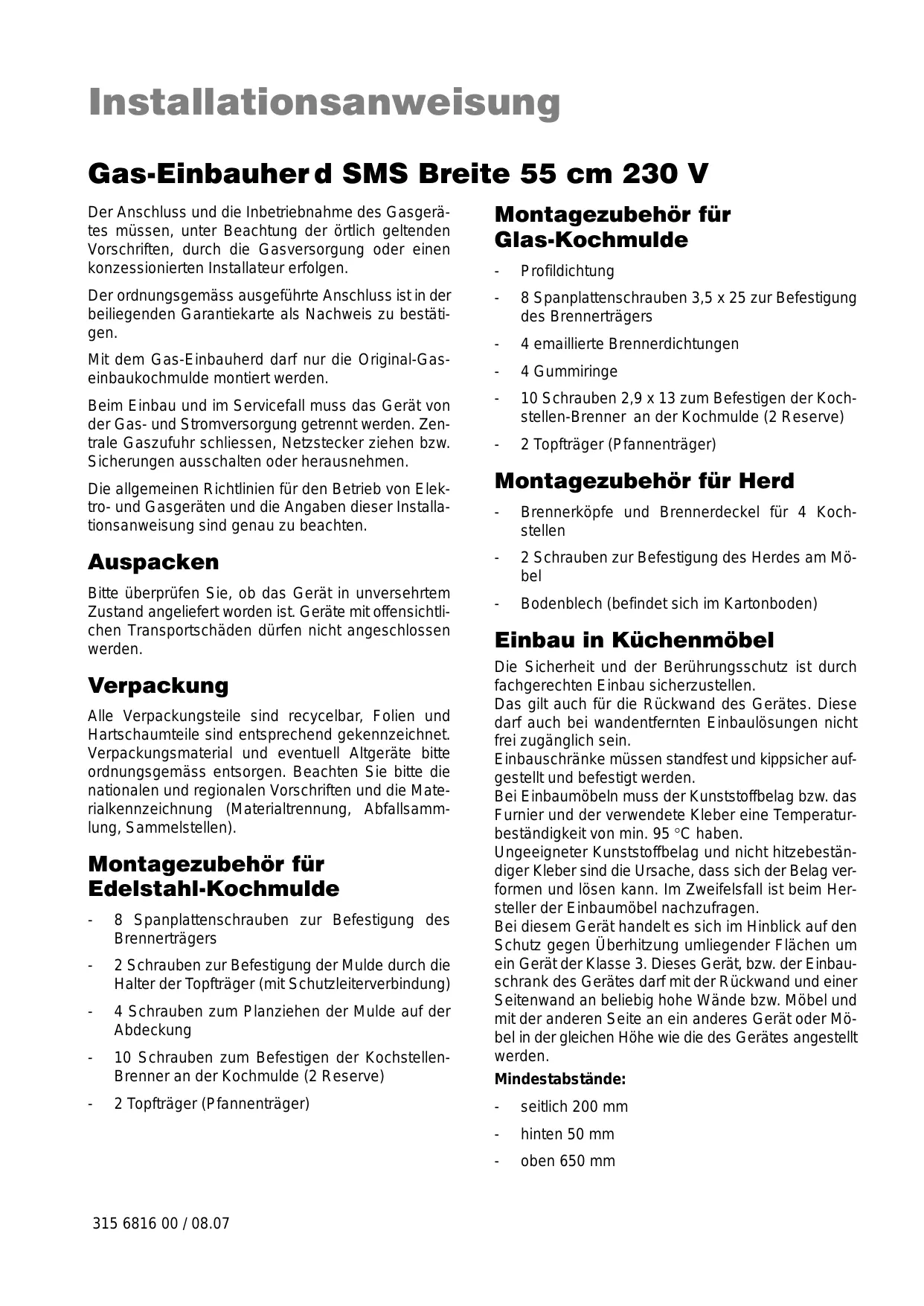 Installationsanweisung Gas−Einbauher d SMS Breite 55 cm 230 V Der Anschluss und die Inbetriebnahme des Gasgerätes müssen, unter Beachtung der örtlich geltenden Vorschriften, durch die Gasversorgung oder einen konzessionierten Installateur erfolgen. Montagezubehör für Glas−Kochmulde