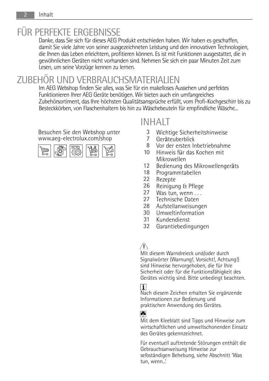 Wichtige Sicherheitshinweise Geräteuberblick Vor der ersten Inbetriebnahme Hinweis für das Kochen mit Mikrowellen Bedienung des Mikrowellengeräts Programmtabellen Rezepte Reinigung & Pflege Was tun, wenn . . . Technische Daten Aufstellanweisungen Umweltinformation Kundendienst Garantiebedingungen Mit diesem Warndreieck und/oder durch Signalwörter (Warnung!, Vorsicht!, Achtung!) sind Hinweise hervorgehoben, die für Ihre Sicherheit oder für die Funktionsfähigkeit des Gerätes wichtig sind. Bitte unbedingt beachten. Nach diesem Zeichen erhalten Sie ergänzende Informationen zur Bedienung und praktischen Anwendung des Gerätes. Mit dem Kleeblatt sind Tipps und Hinweise zum wirtschaftlichen und umweltschonenden Einsatz des Gerätes gekennzeichnet. Für eventuell auftretende Störungen enthält die Gebrauchsanweisung Hinweise zur selbständigen Behebung, siehe Abschnitt ‘Was tun, wenn...’ Wichtige Sicherheitshinweise