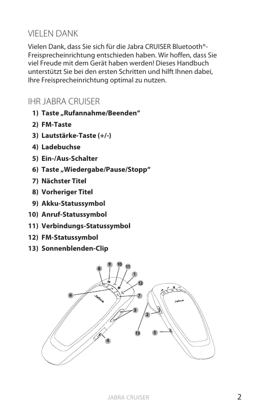 Vielen Dank, dass Sie sich für die Jabra CRUISER Bluetooth®Freisprecheinrichtung entschieden haben. Wir hoffen, dass Sie viel Freude mit dem Gerät haben werden! Dieses Handbuch unterstützt Sie bei den ersten Schritten und hilft Ihnen dabei, Ihre Freisprecheinrichtung optimal zu nutzen.
