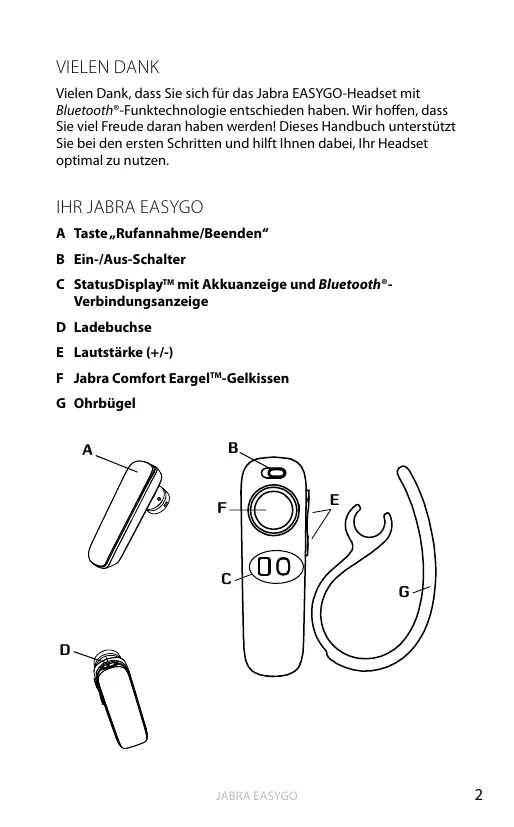 C StatusDisplayTM avec voyants d’état de batterie et de connexion Bluetooth®. D Prise de charge E Commande de volume haut/bas F Jabra Comfort EargelTM G Crochet auriculaire