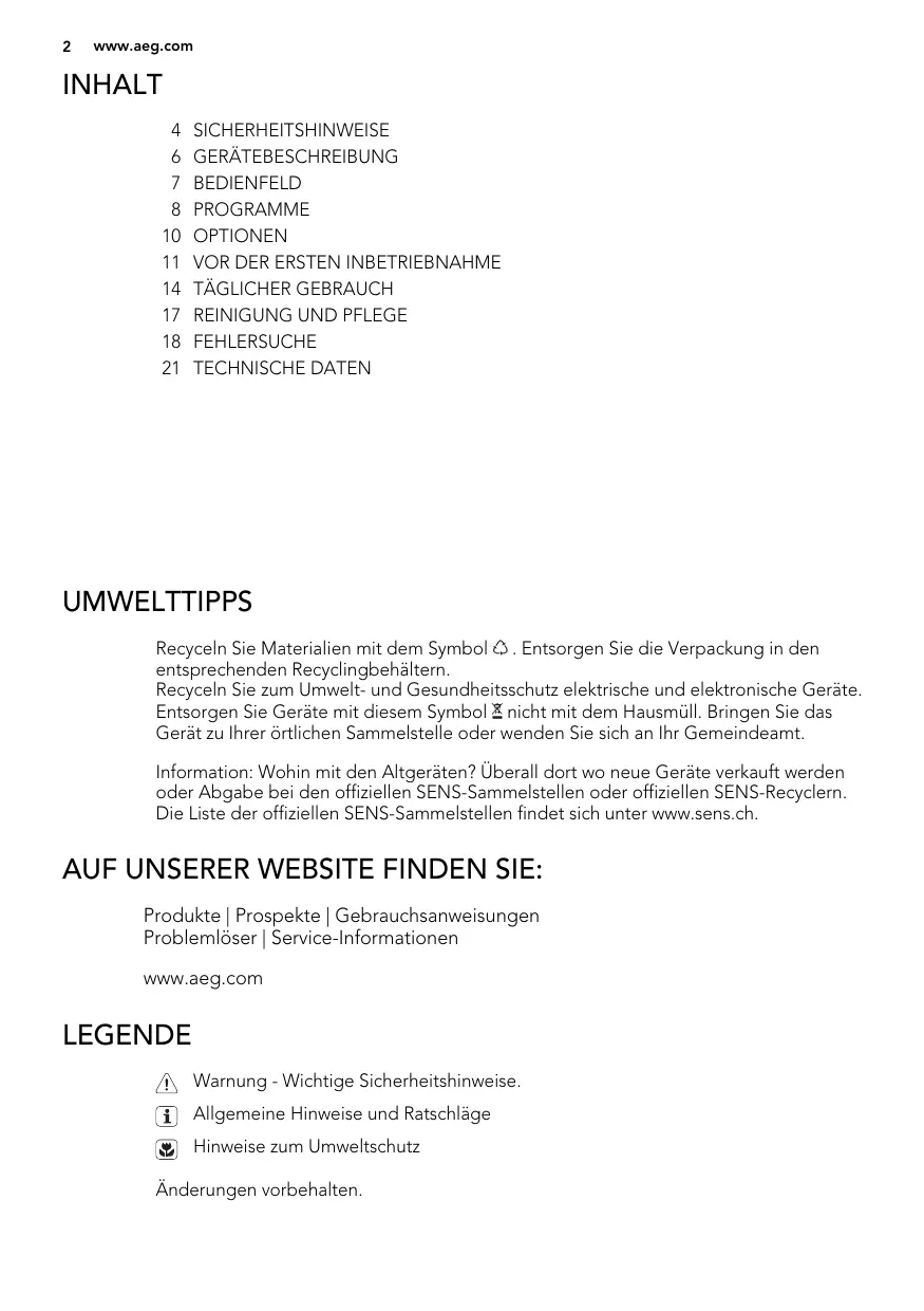 FEHLERSUCHE TECHNISCHE DATEN UMWELTTIPPS Recyceln Sie Materialien mit dem Symbol . Entsorgen Sie die Verpackung in den entsprechenden Recyclingbehältern. Recyceln Sie zum Umwelt- und Gesundheitsschutz elektrische und elektronische Geräte. Entsorgen Sie Geräte mit diesem Symbol nicht mit dem Hausmüll. Bringen Sie das Gerät zu Ihrer örtlichen Sammelstelle oder wenden Sie sich an Ihr Gemeindeamt. Information: Wohin mit den Altgeräten? Überall dort wo neue Geräte verkauft werden oder Abgabe bei den offiziellen SENS-Sammelstellen oder offiziellen SENS-Recyclern. Die Liste der offiziellen SENS-Sammelstellen findet sich unter www.sens.ch. AUF UNSERER WEBSITE FINDEN SIE: Produkte | Prospekte | Gebrauchsanweisungen Problemlöser | Service-Informationen www.aeg.com LEGENDE Warnung - Wichtige Sicherheitshinweise. Allgemeine Hinweise und Ratschläge Hinweise zum Umweltschutz Änderungen vorbehalten. DEUTSCH