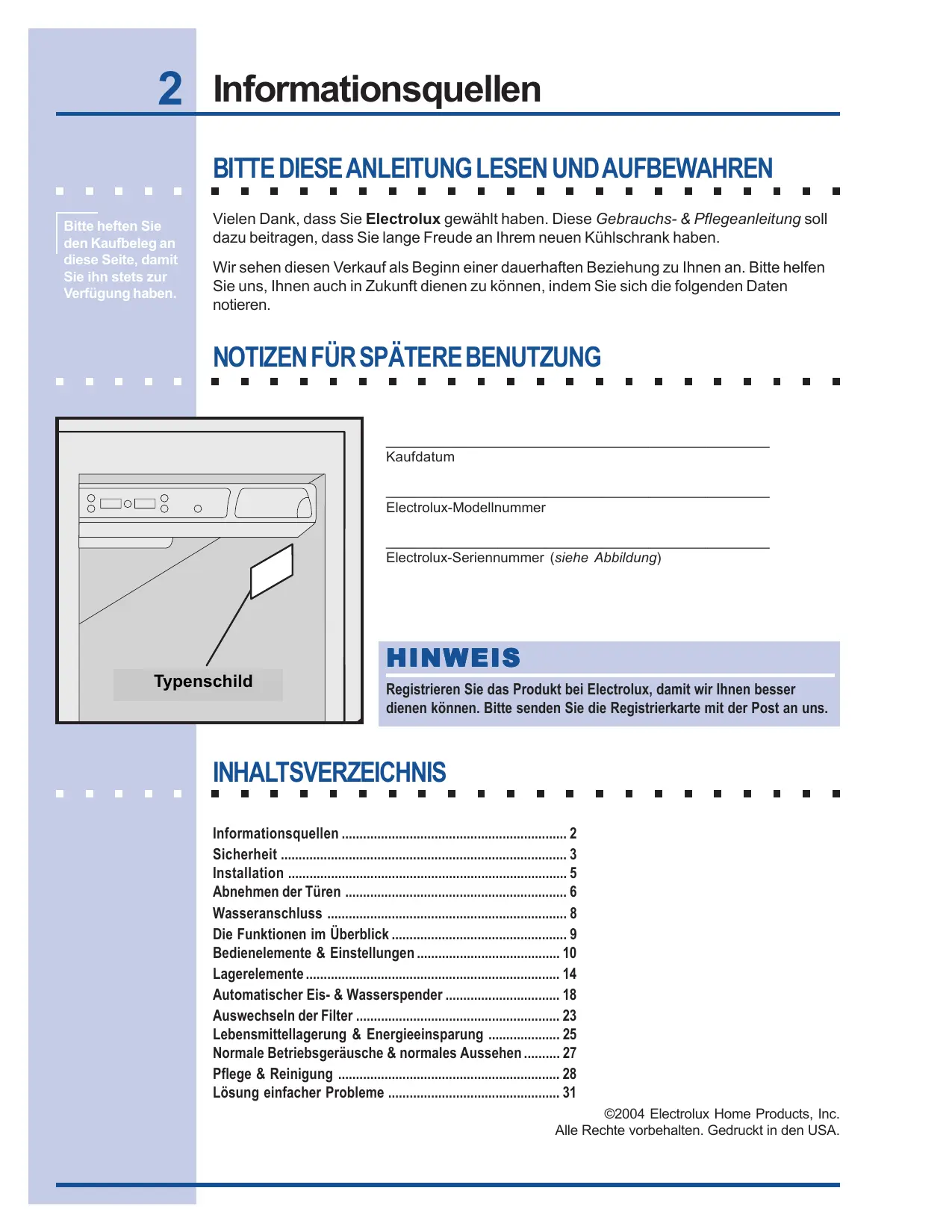 ©2004 Electrolux Home Products, Inc. Alle Rechte vorbehalten. Gedruckt in den USA.
