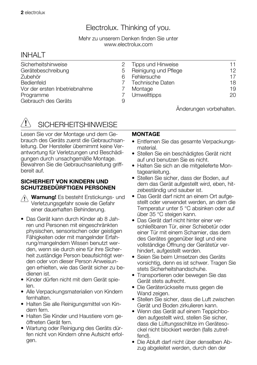 2 electrolux Electrolux. Thinking of you. Mehr zu unserem Denken finden Sie unter www.electrolux.com INHALT Sicherheitshinweise Gerätebeschreibung Zubehör Bedienfeld Vor der ersten Inbetriebnahme Programme Gebrauch des Geräts