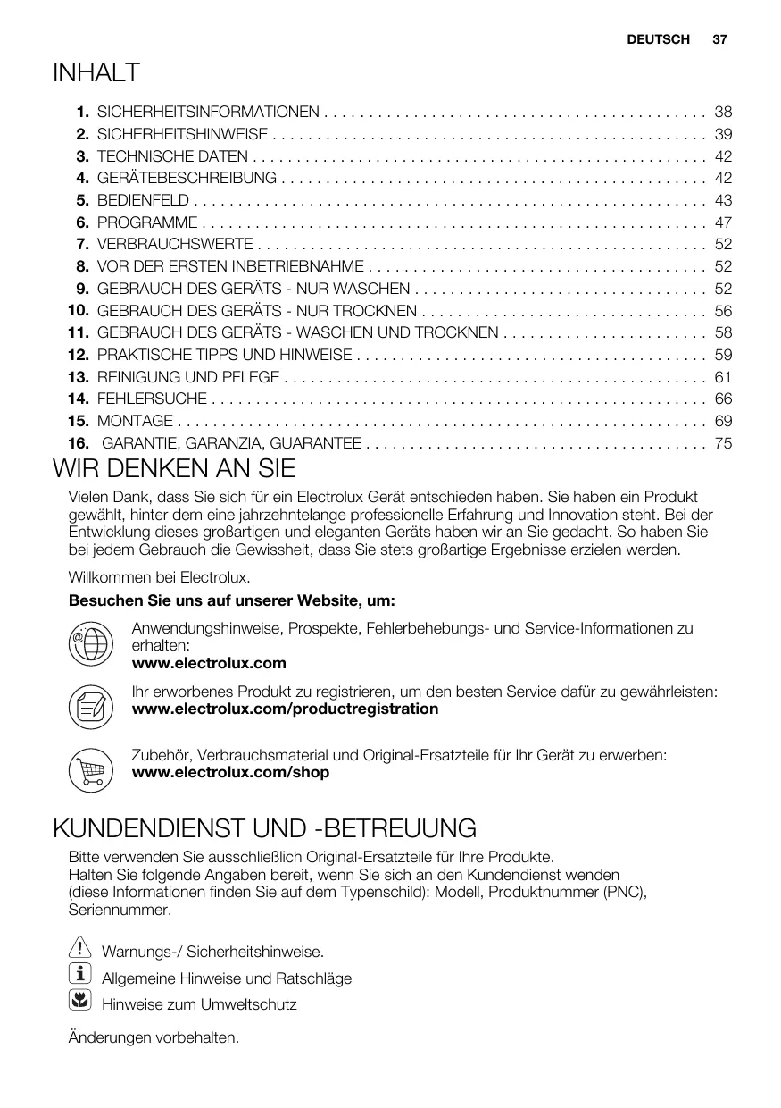Vielen Dank, dass Sie sich für ein Electrolux Gerät entschieden haben. Sie haben ein Produkt gewähit, hinter dem eine jahrzehntelange professionelle Erfahrung und Innovation steht. Bei der Entwicklung dieses groBartigen und eleganten Geräts haben wir an Sie gedacht. So haben Sie bei jedem Gebrauch die Gewissheit, dass Sie stets groBartige Ergebnisse erzielen werden. Willkommen bei Electrolux. Besuchen Sie uns auf unserer Website, um: Anwendungshinweise, Prospekte, Fehlerbehebungs- und Service-Informationen zu erhalten: www.electrolux.com www.electrolux.com/productregistration Zubehër, Verbrauchsmaterial und Original-Ersatzteile für Inr Gerät zu enwerben: www.electrolux.com/shop