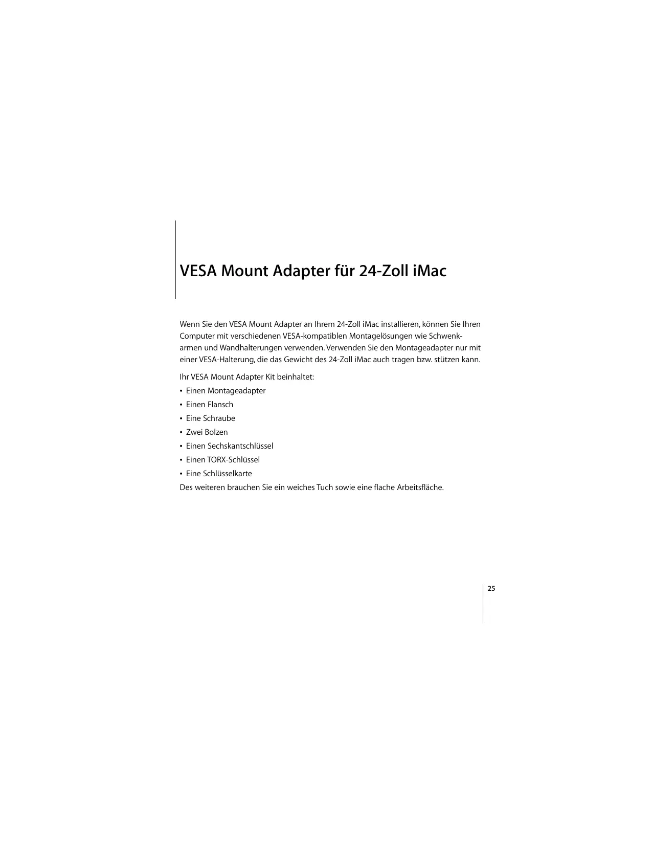 VESA Mount Adapter für 24-Zoll iMac Wenn Sie den VESA Mount Adapter an Ihrem 24-Zoll iMac installieren, können Sie Ihren Computer mit verschiedenen VESA-kompatiblen Montagelösungen wie Schwenkarmen und Wandhalterungen verwenden. Verwenden Sie den Montageadapter nur mit einer VESA-Halterung, die das Gewicht des 24-Zoll iMac auch tragen bzw. stützen kann. Ihr VESA Mount Adapter Kit beinhaltet:  Einen Montageadapter  Einen Flansch  Eine Schraube  Zwei Bolzen  Einen Sechskantschlüssel  Einen TORX-Schlüssel  Eine Schlüsselkarte Des weiteren brauchen Sie ein weiches Tuch sowie eine flache Arbeitsfläche.