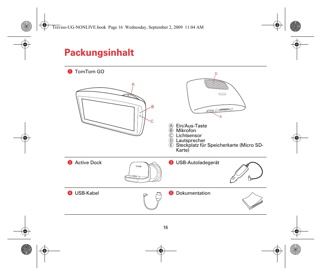 SE d PS D 2 Treviso-UG-NONLIVE.book Page 16 Wednesday, September 2, 2009 11:04 AM KYP7 œ A A 2 . & Packungsinhalt © TomTom GO Ein/Aus-Taste Mikrofon Lichtsensor 4 Lautsprecher E— Steckplatz für Speicherkarte (Micro SD- Karte) © Active Dock © USB-Autoladegerät © USBKabel = © Dokumentation F D S 16 PS