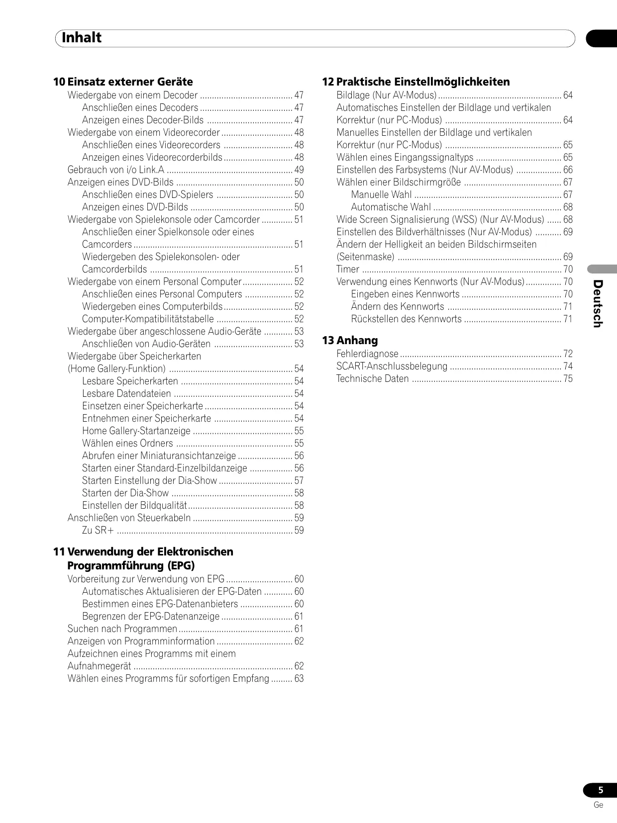 Wiedergabe von einem Decoder 47 Anschließen eines Decoders 47 Anzeigen eines Decoder-Bilds 47 Wiedergabe von einem Videorecorder 48 Anschließen eines Videorecorders 48 Anzeigen eines Videorecorderbilds 48 Gebrauch von i/o Link.A 49 Anzeigen eines DVD-Bilds 50 Anschließen eines DVD-Spielers 50 Anzeigen eines DVD-Bilds 50 Wiedergabe von Spielekonsole oder Camcorder 51 Anschließen einer Spielkonsole oder eines Camcorders 51 Wiedergeben des Spielekonsolen- oder Camcorderbilds 51 Wiedergabe von einem Personal Computer 52 Anschließen eines Personal Computers 52 Wiedergeben eines Computerbilds 52 Computer-Kompatibilitätstabelle 52 Wiedergabe über angeschlossene Audio-Geräte 53 Anschließen von Audio-Geräten 53 Wiedergabe über Speicherkarten (Home Gallery-Funktion) 54 Lesbare Speicherkarten 54 Lesbare Datendateien 54 Einsetzen einer Speicherkarte 54 Entnehmen einer Speicherkarte 54 Home Gallery-Startanzeige 55 Wählen eines Ordners 55 Abrufen einer Miniaturansichtanzeige 56 Starten einer Standard-Einzelbildanzeige 56 Starten Einstellung der Dia-Show 57 Starten der Dia-Show 58 Einstellen der Bildqualität 58 Anschließen von Steuerkabeln 59 Zu SR+ 59