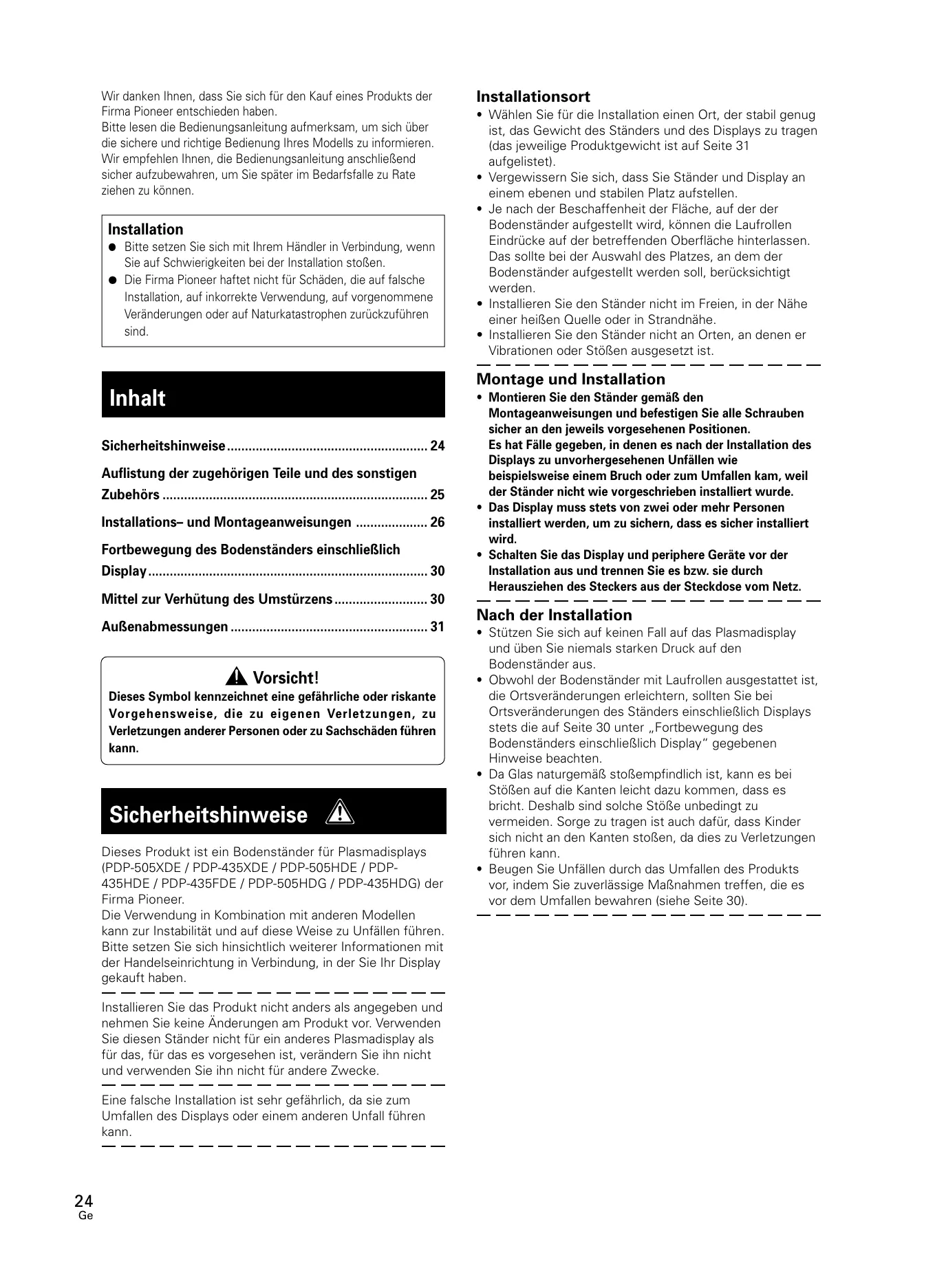 Wir danken Ihnen, dass Sie sich für den Kauf eines Produkts der Firma Pioneer entschieden haben. Bitte lesen die Bedienungsanleitung aufmerksam, um sich über die sichere und richtige Bedienung lhres Modells zu informieren. Wir empfehlen lhnen, die Bedienungsanleitung anschlieRend sicher aufzubewahren, um Sie spâter im Bedarfsfalle zu Rate ziehen zu kônnen. Installation © Bitte setzen Sie sich mit Ihrem Händler in Verbindung, wenn Sie auf Schwierigkeiten bei der Installation stoRen. © Die Firma Pioneer haftet nicht für Schäden, die auf falsche Installation, auf inkorrekte Verwendung, auf vorgenommene Veränderungen oder auf Naturkatastrophen zurückzuführen sind. Sicherheitshinweise … Auflistung der zugehôürigen Teile und des sonstigen Zubehôrs Installations- und Montageanweisungen Fortbewegung des Bodenständers einschlieRlich Display. Mittel zur Verhütung des Umstürzens AuRenabmessungen … À Vorsicht! Dieses Symbol kennzeichnet eine gefährliche oder riskante Vorgehensweise, die zu eigenen Verletzungen, zu Verletzungen anderer Personen oder zu Sachschäden führen kann. Sicherheitshinweise À Dieses Produkt ist ein Bodenständer für Plasmadisplays ({PDP-505XDE / PDP-435XDE / PDP-505HDE / PDP- 435HDE / PDP-436FDE / PDP-505HDG / PDP-435HDG) der Firma Pioneer. Die Verwendung in Kombination mit anderen Modellen kann zur Instabilität und auf diese Weise zu Unfällen führen Bitte setzen Sie sich hinsichtlich weiterer Informationen mit der Handelseinrichtung in Verbindung, in der Sie Ihr Display gekauft haben. Installieren Sie das Produkt nicht anders als angegeben und nehmen Sie keine Anderungen am Produkt vor. Verwenden Sie diesen Ständer nicht für ein anderes Plasmadisplay als für das, für das es vorgesehen ist, verändern Sie ihn nicht und verwenden Sie ihn nicht für andere Zwecke. Eine falsche Installation ist sehr gefährlich, da sie zum Umfallen des Displays oder einem anderen Unfall führen kann Installationsort Wählen Sie für die Installation einen Ort, der stabil genug ist, das Gewicht des Ständers und des Displays zu tragen (das jeweilige Produktgewicht ist auf Seite 31 aufgelistet) Vergewissern Sie sich, dass Sie Ständer und Display an einem ebenen und stabilen Platz aufstellen. Je nach der Beschaffenheit der Flâche, auf der der Bodenständer aufgestellt wird, kônnen die Laufrollen Eindrücke auf der betreffenden Oberfläche hinterlassen Das sollte bei der Auswahl des Platzes, an dem der Bodenständer aufgestellt werden soll, berücksichtigt werden Installieren Sie den Ständer nicht im Freien, in der Nähe einer heiBen Quelle oder in Strandnähe. Installieren Sie den Ständer nicht an Orten, an denen er Vibrationen oder StôBen ausgesetzt ist. Montage und Installation Montieren Sie den Ständer gemäf den Montageanweisungen und befestigen Sie alle Schrauben sicher an den jeweils vorgesehenen Positionen. Es hat Fälle gegeben, in denen es nach der Installation des Displays zu unvorhergesehenen Unfällen wie beispielsweise einem Bruch oder zum Umfallen kam, weil der Ständer nicht wie vorgeschrieben installiert wurde. Das Display muss stets von zwei oder mehr Personen installiert werden, um zu sichern, dass es sicher installiert wird. Schalten Sie das Display und periphere Gerâte vor der Installation aus und trennen Sie es bzw. sie durch Herausziehen des Steckers aus der Steckdose vom Netz. Nach der Installation Stützen Sie sich auf keinen Fall auf das Plasmadisplay und üben Sie niemals starken Druck auf den Bodenständer aus. Obwohl der Bodenständer mit Laufrollen ausgestattet ist, die Ortsveränderungen erleichtern, sollten Sie bei Ortsveränderungen des Ständers einschlieRlich Displays stets die auf Seite 30 unter ,Fortbewegung des Bodenständers einschlieRlich Display” gegebenen Hinweise beachten. Da Glas naturgemäR stoRempfindlich ist, kann es bei Stôken auf die Kanten leicht dazu kommen, dass es bricht. Deshalb sind solche StôRe unbedingt zu vermeiden. Sorge zu tragen ist auch dafür, dass Kinder sich nicht an den Kanten stoRen, da dies zu Verletzungen führen kann. Beugen Sie Unfällen durch das Umfallen des Produkts vor, indem Sie zuverlässige MaRnahmen treffen, die es vor dem Umfallen bewahren (siehe Seite 30)