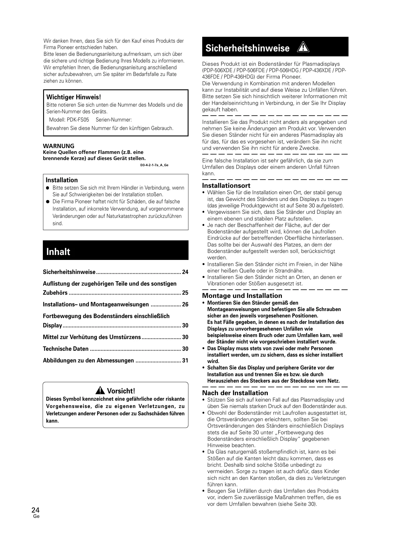 - Wir danken Ihnen, dass Sie sich für den Kauf eines Produkts der Firma Pioneer entschieden haben. Bitte lesen die Bedienungsanleitung aufmerksam, um sich über die sichere und richtige Bedienung Ihres Modells zu informieren. Wir empfehlen Ihnen, die Bedienungsanleitung anschließend sicher aufzubewahren, um Sie später im Bedarfsfalle zu Rate ziehen zu können. Wichtiger Hinweis! Bitte notieren Sie sich unten die Nummer des Modells und die Serien-Nummer des Geräts. Modell: PDK-FS05 Serien-Nummer: Bewahren Sie diese Nummer für den künftigen Gebrauch. WARNUNG Keine Quellen offener Flammen (z.B. eine brennende Kerze) auf dieses Gerät stellen. D3-4-2-1-7a_A_Ge Installation ¶ Bitte setzen Sie sich mit Ihrem Händler in Verbindung, wenn Sie auf Schwierigkeiten bei der Installation stoßen. ¶ Die Firma Pioneer haftet nicht für Schäden, die auf falsche Installation, auf inkorrekte Verwendung, auf vorgenommene Veränderungen oder auf Naturkatastrophen zurückzuführen sind. Inhalt Sicherheitshinweise p. 24