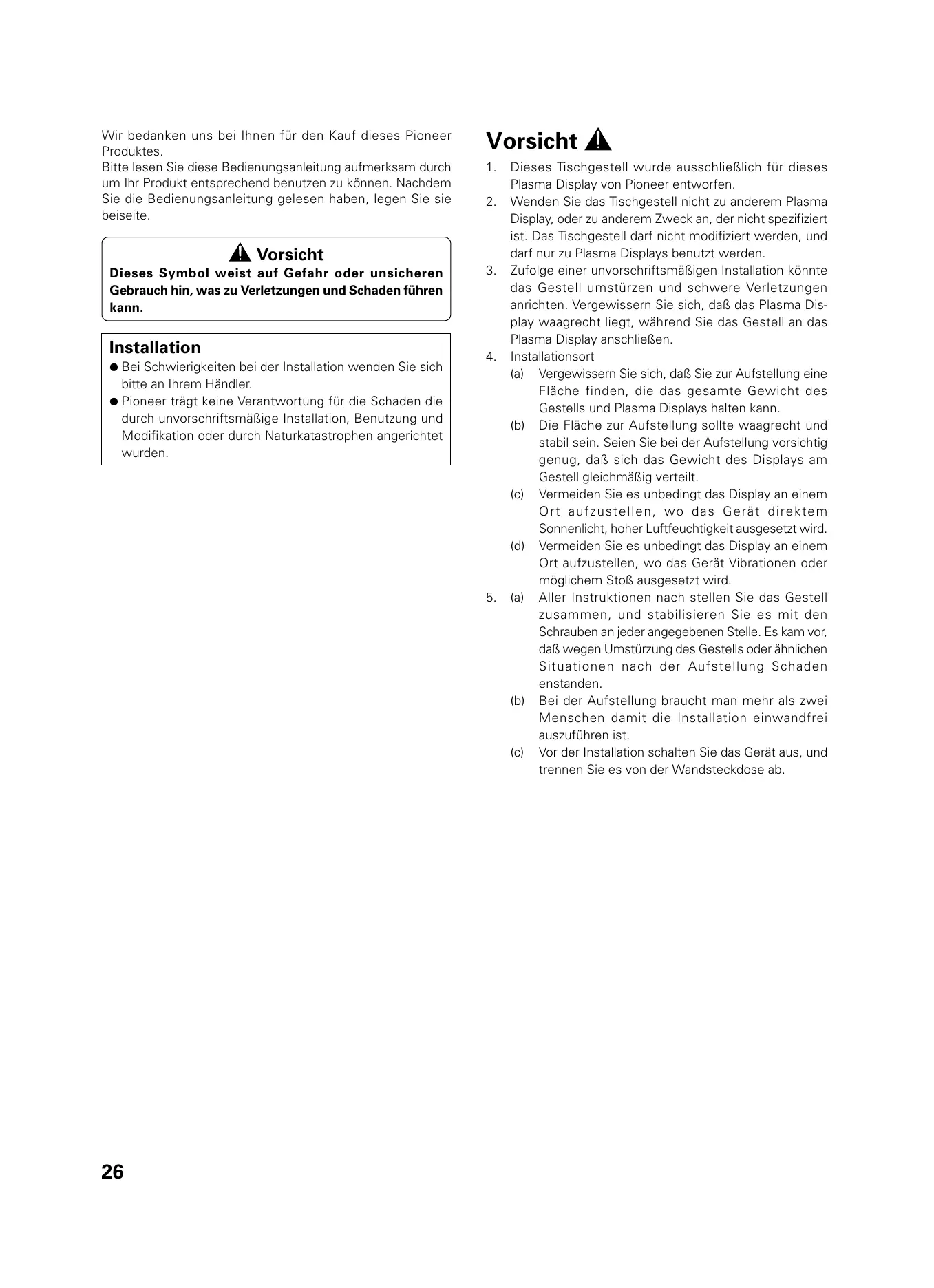 Dieses Tischgestell wurde ausschließlich für dieses Plasma Display von Pioneer entworfen. Wenden Sie das Tischgestell nicht zu anderem Plasma Display, oder zu anderem Zweck an, der nicht spezifiziert ist. Das Tischgestell darf nicht modifiziert werden, und darf nur zu Plasma Displays benutzt werden. Zufolge einer unvorschriftsmäßigen Installation könnte das Gestell umstürzen und schwere Verletzungen anrichten. Vergewissern Sie sich, daß das Plasma Display waagrecht liegt, während Sie das Gestell an das Plasma Display anschließen. Installationsort (a) Vergewissern Sie sich, daß Sie zur Aufstellung eine Fläche finden, die das gesamte Gewicht des Gestells und Plasma Displays halten kann. (b) Die Fläche zur Aufstellung sollte waagrecht und stabil sein. Seien Sie bei der Aufstellung vorsichtig genug, daß sich das Gewicht des Displays am Gestell gleichmäßig verteilt. (c) Vermeiden Sie es unbedingt das Display an einem Ort aufzustellen, wo das Gerät direktem Sonnenlicht, hoher Luftfeuchtigkeit ausgesetzt wird. (d) Vermeiden Sie es unbedingt das Display an einem Ort aufzustellen, wo das Gerät Vibrationen oder möglichem Stoß ausgesetzt wird. (a) Aller Instruktionen nach stellen Sie das Gestell zusammen, und stabilisieren Sie es mit den Schrauben an jeder angegebenen Stelle. Es kam vor, daß wegen Umstürzung des Gestells oder ähnlichen Situationen nach der Aufstellung Schaden enstanden. (b) Bei der Aufstellung braucht man mehr als zwei Menschen damit die Installation einwandfrei auszuführen ist. (c) Vor der Installation schalten Sie das Gerät aus, und trennen Sie es von der Wandsteckdose ab.