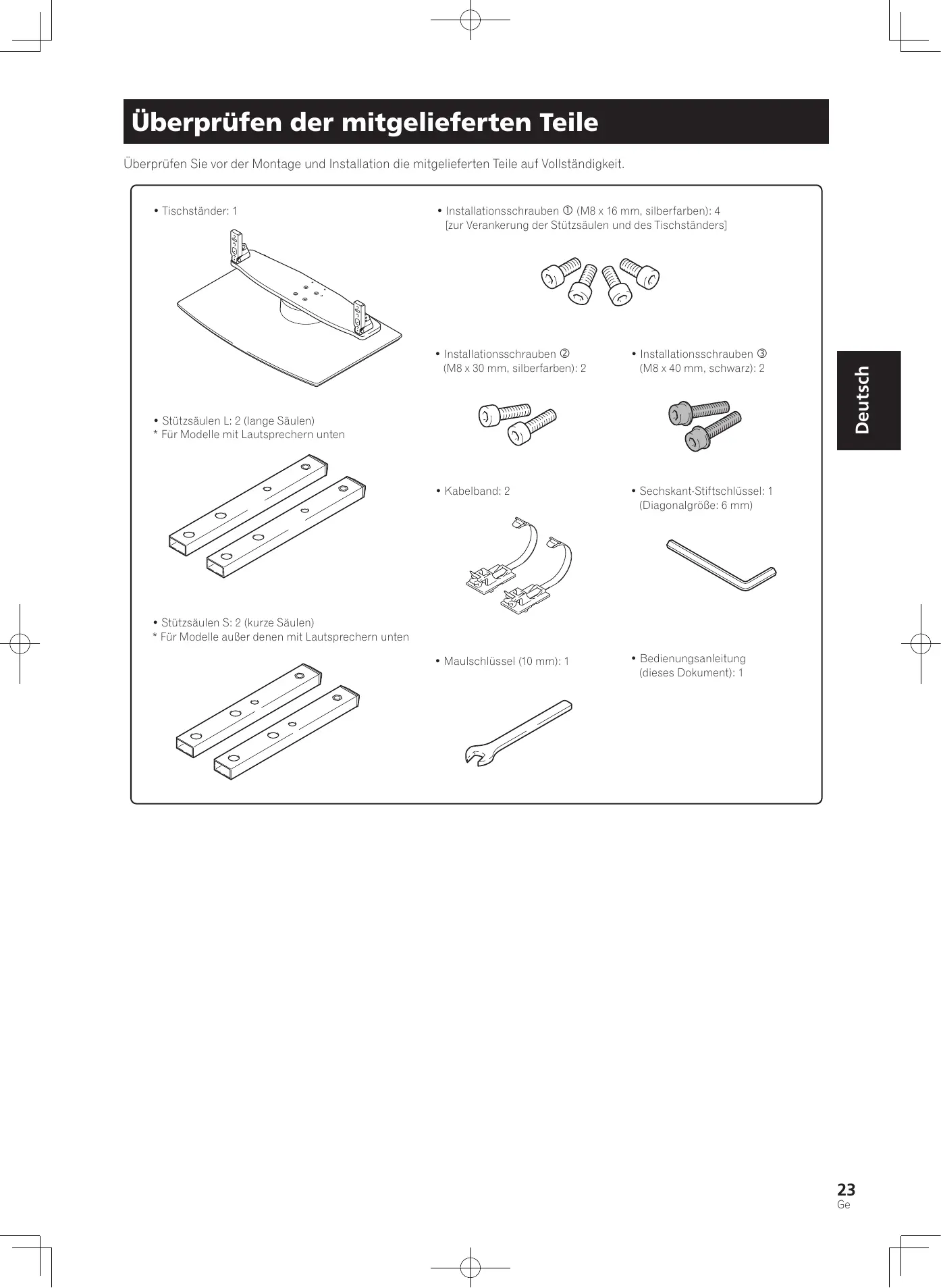 Inhalt Sicherheitshinweise 22 Überprüfen der mitgelieferten Teile 23 Montage des Ständers 24 Montage des Pioneer-Fernsehers 25 Justiermechanismus für den Neigungswinkel nach vorn und nach hinten 26 Installieren des Produkts auf einem Fernsehtisch oder etwas Ähnlichem 27 Verlegen der Kabel 28 Mittel zur Verhütung des Umstürzens 29 Fixierung der Drehung an der Vorderseite 30 Abmontieren des Pioneer-Fernsehers vom Ständer 30 Technische Daten 30 Abbildungen zu den Abmessungen 31