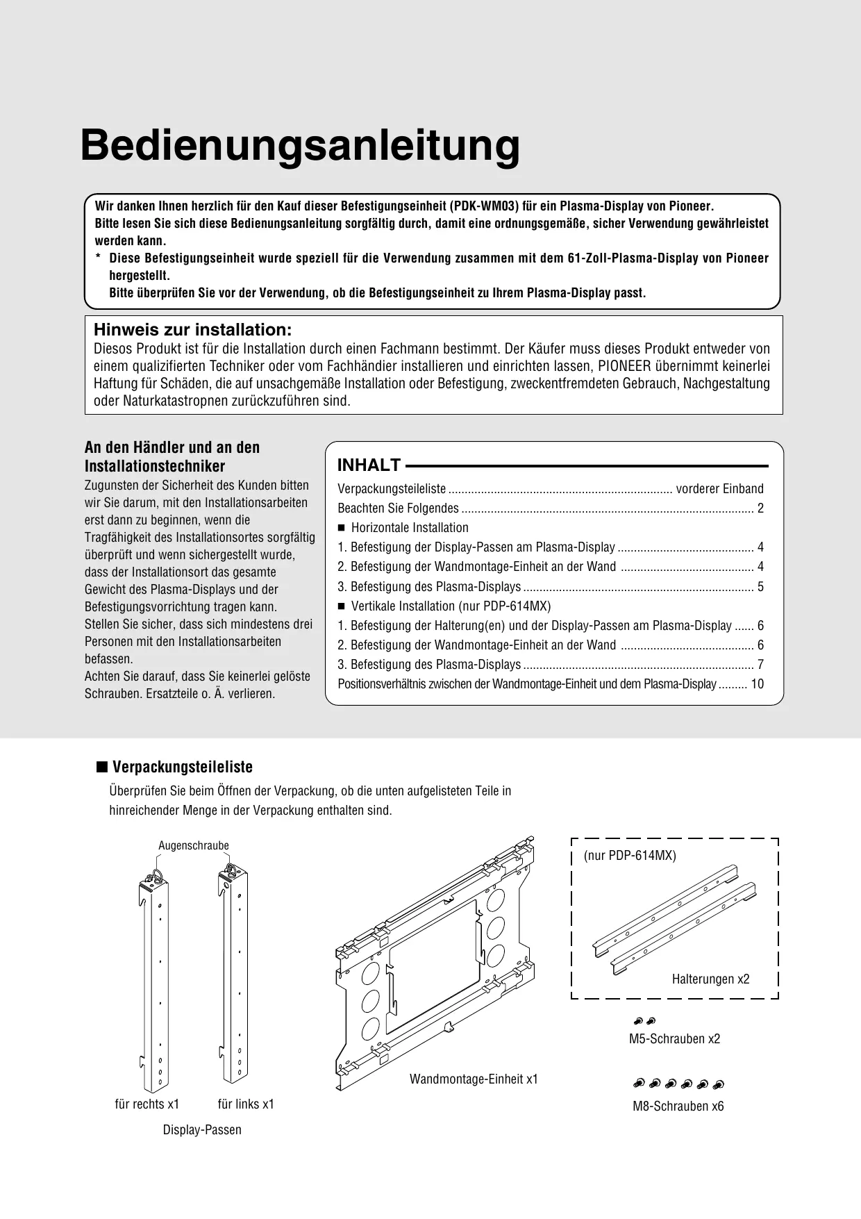 INHALT Verpackungsteileliste vorderer Einband Beachten Sie Folgendes 2 䡲 Horizontale Installation 1. Befestigung der Display-Passen am Plasma-Display 4 2. Befestigung der Wandmontage-Einheit an der Wand 4 3. Befestigung des Plasma-Displays 5 䡲 Vertikale Installation (nur PDP-614MX) 1. Befestigung der Halterung(en) und der Display-Passen am Plasma-Display 6 2. Befestigung der Wandmontage-Einheit an der Wand 6 3. Befestigung des Plasma-Displays 7 Positionsverhältnis zwischen der Wandmontage-Einheit und dem Plasma-Display 10