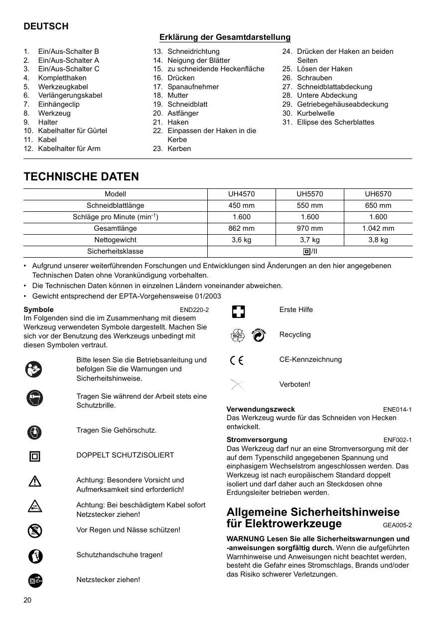 Erste Hilfe Recycling CE-Kennzeichnung Verboten! ENE014-1 Verwendungszweck Das Werkzeug wurde für das Schneiden von Hecken entwickelt.