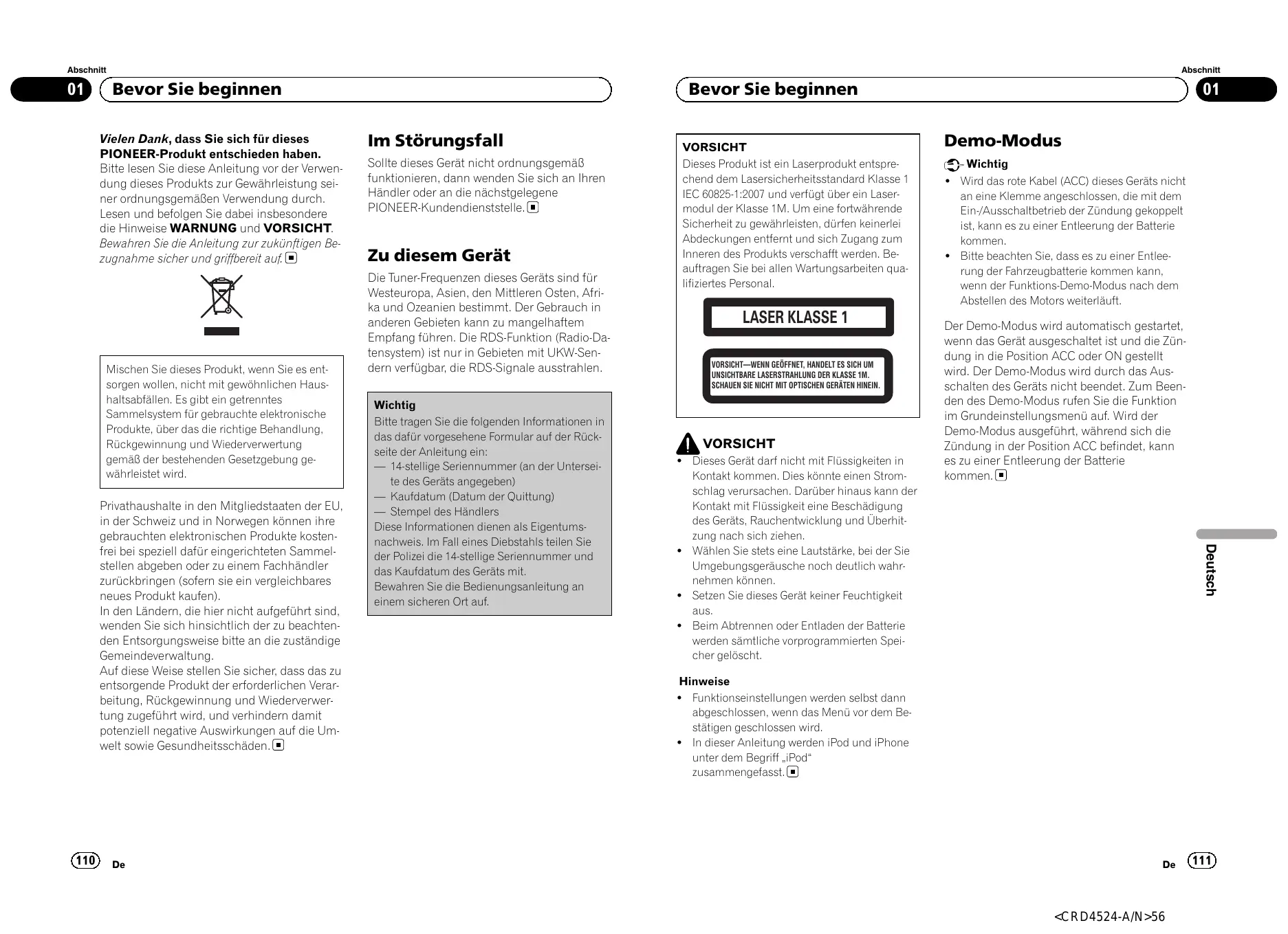 Im Störungsfall Sollte dieses Gerät nicht ordnungsgemäß funktionieren, dann wenden Sie sich an Ihren Händler oder an die nächstgelegene PIONEER-Kundendienststelle. Zu diesem Gerät Die Tuner-Frequenzen dieses Geräts sind für Westeuropa, Asien, den Mittleren Osten, Afrika und Ozeanien bestimmt. Der Gebrauch in anderen Gebieten kann zu mangelhaftem Empfang führen. Die RDS-Funktion (Radio-Datensystem) ist nur in Gebieten mit UKW-Sendern verfügbar, die RDS-Signale ausstrahlen. Wichtig Bitte tragen Sie die folgenden Informationen in das dafür vorgesehene Formular auf der Rückseite der Anleitung ein: — 14-stellige Seriennummer (an der Unterseite des Geräts angegeben) — Kaufdatum (Datum der Quittung) — Stempel des Händlers Diese Informationen dienen als Eigentumsnachweis. Im Fall eines Diebstahls teilen Sie der Polizei die 14-stellige Seriennummer und das Kaufdatum des Geräts mit. Bewahren Sie die Bedienungsanleitung an einem sicheren Ort auf. VORSICHT Dieses Produkt ist ein Laserprodukt entsprechend dem Lasersicherheitsstandard Klasse 1 IEC 60825-1:2007 und verfügt über ein Lasermodul der Klasse 1M. Um eine fortwährende Sicherheit zu gewährleisten, dürfen keinerlei Abdeckungen entfernt und sich Zugang zum Inneren des Produkts verschafft werden. Beauftragen Sie bei allen Wartungsarbeiten qualifiziertes Personal. LASER KLASSE 1 VORSICHT—WENN GEÖFFNET, HANDELT ES SICH UM UNSICHTBARE LASERSTRAHLUNG DER KLASSE 1M. SCHAUEN SIE NICHT MIT OPTISCHEN GERÄTEN HINEIN. VORSICHT ! Dieses Gerät darf nicht mit Flüssigkeiten in Kontakt kommen. Dies könnte einen Stromschlag verursachen. Darüber hinaus kann der Kontakt mit Flüssigkeit eine Beschädigung des Geräts, Rauchentwicklung und Überhitzung nach sich ziehen. ! Wählen Sie stets eine Lautstärke, bei der Sie Umgebungsgeräusche noch deutlich wahrnehmen können. ! Setzen Sie dieses Gerät keiner Feuchtigkeit aus. ! Beim Abtrennen oder Entladen der Batterie werden sämtliche vorprogrammierten Speicher gelöscht.