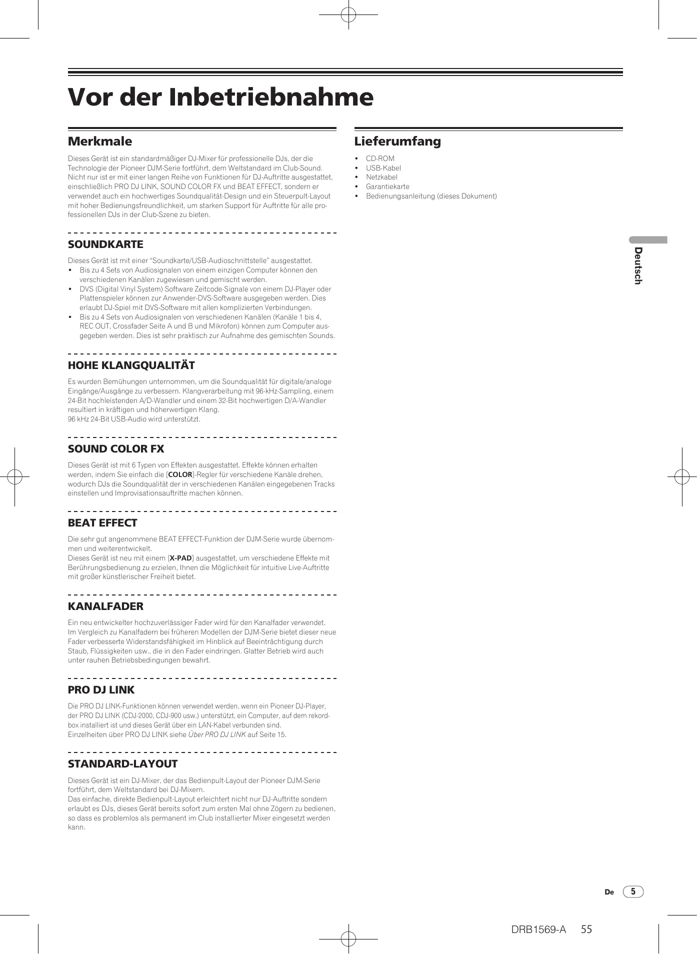 Vor der Inbetriebnahme Merkmale Lieferumfang Dieses Gerät ist ein standardmäßiger DJ-Mixer für professionelle DJs, der die Technologie der Pioneer DJM-Serie fortführt, dem Weltstandard im Club-Sound. Nicht nur ist er mit einer langen Reihe von Funktionen für DJ-Auftritte ausgestattet, einschließlich PRO DJ LINK, SOUND COLOR FX und BEAT EFFECT, sondern er verwendet auch ein hochwertiges Soundqualität-Design und ein Steuerpult-Layout mit hoher Bedienungsfreundlichkeit, um starken Support für Auftritte für alle professionellen DJs in der Club-Szene zu bieten.
