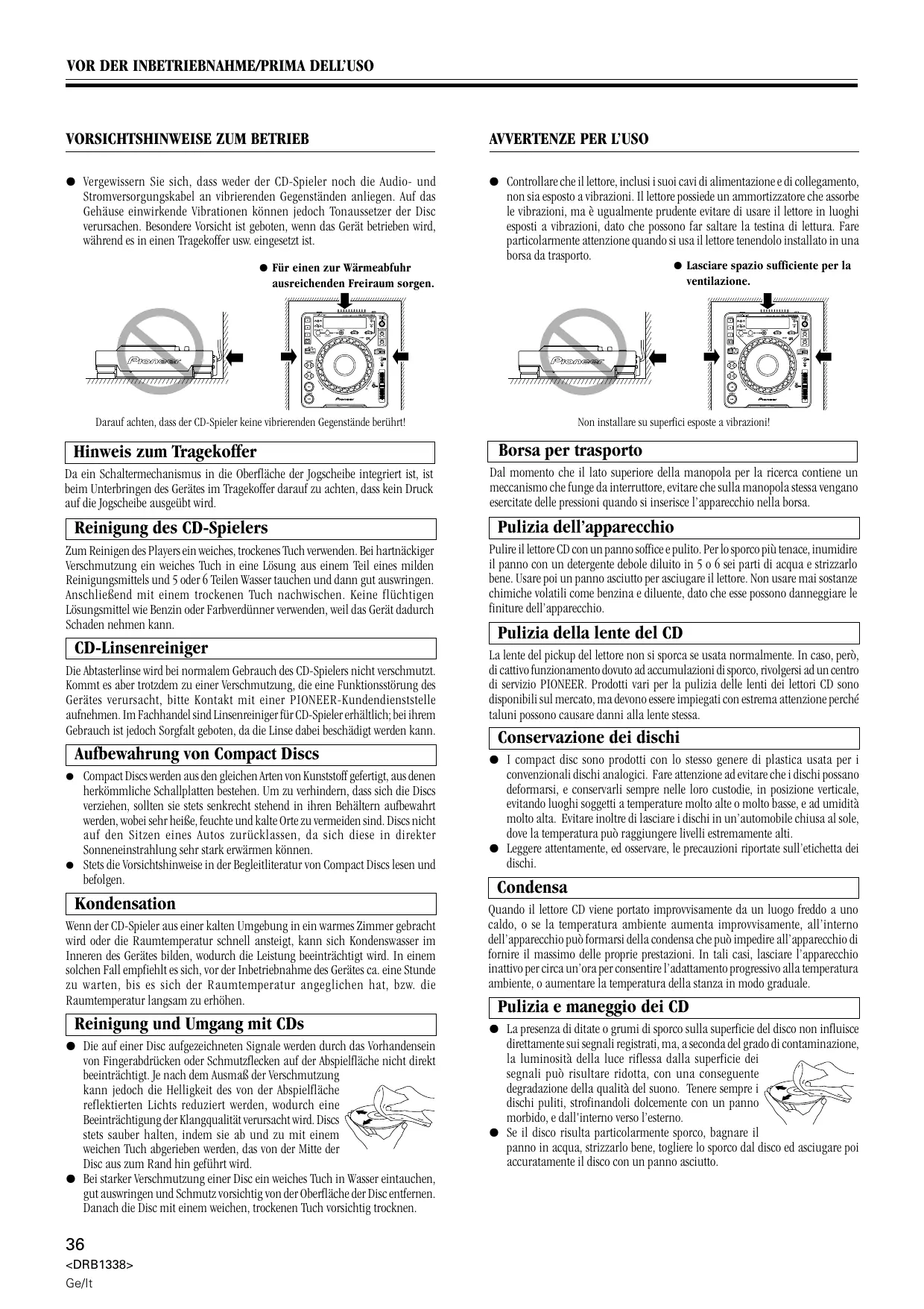 ¶ Vergewissern Sie sich, dass weder der CD-Spieler noch die Audio- und Stromversorgungskabel an vibrierenden Gegenständen anliegen. Auf das Gehäuse einwirkende Vibrationen können jedoch Tonaussetzer der Disc verursachen. Besondere Vorsicht ist geboten, wenn das Gerät betrieben wird, während es in einen Tragekoffer usw. eingesetzt ist. ¶ Controllare che il lettore, inclusi i suoi cavi di alimentazione e di collegamento, non sia esposto a vibrazioni. Il lettore possiede un ammortizzatore che assorbe le vibrazioni, ma è ugualmente prudente evitare di usare il lettore in luoghi esposti a vibrazioni, dato che possono far saltare la testina di lettura. Fare particolarmente attenzione quando si usa il lettore tenendolo installato in una borsa da trasporto. ¶ Für einen zur Wärmeabfuhr ausreichenden Freiraum sorgen. ¶ Lasciare spazio sufficiente per la ventilazione. Darauf achten, dass der CD-Spieler keine vibrierenden Gegenstände berührt! Hinweis zum Tragekoffer Da ein Schaltermechanismus in die Oberfläche der Jogscheibe integriert ist, ist beim Unterbringen des Gerätes im Tragekoffer darauf zu achten, dass kein Druck auf die Jogscheibe ausgeübt wird. Reinigung des CD-Spielers Zum Reinigen des Players ein weiches, trockenes Tuch verwenden. Bei hartnäckiger Verschmutzung ein weiches Tuch in eine Lösung aus einem Teil eines milden Reinigungsmittels und 5 oder 6 Teilen Wasser tauchen und dann gut auswringen. Anschließend mit einem trockenen Tuch nachwischen. Keine flüchtigen Lösungsmittel wie Benzin oder Farbverdünner verwenden, weil das Gerät dadurch Schaden nehmen kann. CD-Linsenreiniger Die Abtasterlinse wird bei normalem Gebrauch des CD-Spielers nicht verschmutzt. Kommt es aber trotzdem zu einer Verschmutzung, die eine Funktionsstörung des Gerätes verursacht, bitte Kontakt mit einer PIONEER-Kundendienststelle aufnehmen. Im Fachhandel sind Linsenreiniger für CD-Spieler erhältlich; bei ihrem Gebrauch ist jedoch Sorgfalt geboten, da die Linse dabei beschädigt werden kann. Aufbewahrung von Compact Discs ÷ Compact Discs werden aus den gleichen Arten von Kunststoff gefertigt, aus denen herkömmliche Schallplatten bestehen. Um zu verhindern, dass sich die Discs verziehen, sollten sie stets senkrecht stehend in ihren Behältern aufbewahrt werden, wobei sehr heiße, feuchte und kalte Orte zu vermeiden sind. Discs nicht auf den Sitzen eines Autos zurücklassen, da sich diese in direkter Sonneneinstrahlung sehr stark erwärmen können. ÷ Stets die Vorsichtshinweise in der Begleitliteratur von Compact Discs lesen und befolgen. Kondensation Wenn der CD-Spieler aus einer kalten Umgebung in ein warmes Zimmer gebracht wird oder die Raumtemperatur schnell ansteigt, kann sich Kondenswasser im Inneren des Gerätes bilden, wodurch die Leistung beeinträchtigt wird. In einem solchen Fall empfiehlt es sich, vor der Inbetriebnahme des Gerätes ca. eine Stunde zu warten, bis es sich der Raumtemperatur angeglichen hat, bzw. die Raumtemperatur langsam zu erhöhen. Reinigung und Umgang mit CDs ¶ Die auf einer Disc aufgezeichneten Signale werden durch das Vorhandensein von Fingerabdrücken oder Schmutzflecken auf der Abspielfläche nicht direkt beeinträchtigt. Je nach dem Ausmaß der Verschmutzung kann jedoch die Helligkeit des von der Abspielfläche reflektierten Lichts reduziert werden, wodurch eine Beeinträchtigung der Klangqualität verursacht wird. Discs stets sauber halten, indem sie ab und zu mit einem weichen Tuch abgerieben werden, das von der Mitte der Disc aus zum Rand hin geführt wird. ¶ Bei starker Verschmutzung einer Disc ein weiches Tuch in Wasser eintauchen, gut auswringen und Schmutz vorsichtig von der Oberfläche der Disc entfernen. Danach die Disc mit einem weichen, trockenen Tuch vorsichtig trocknen.