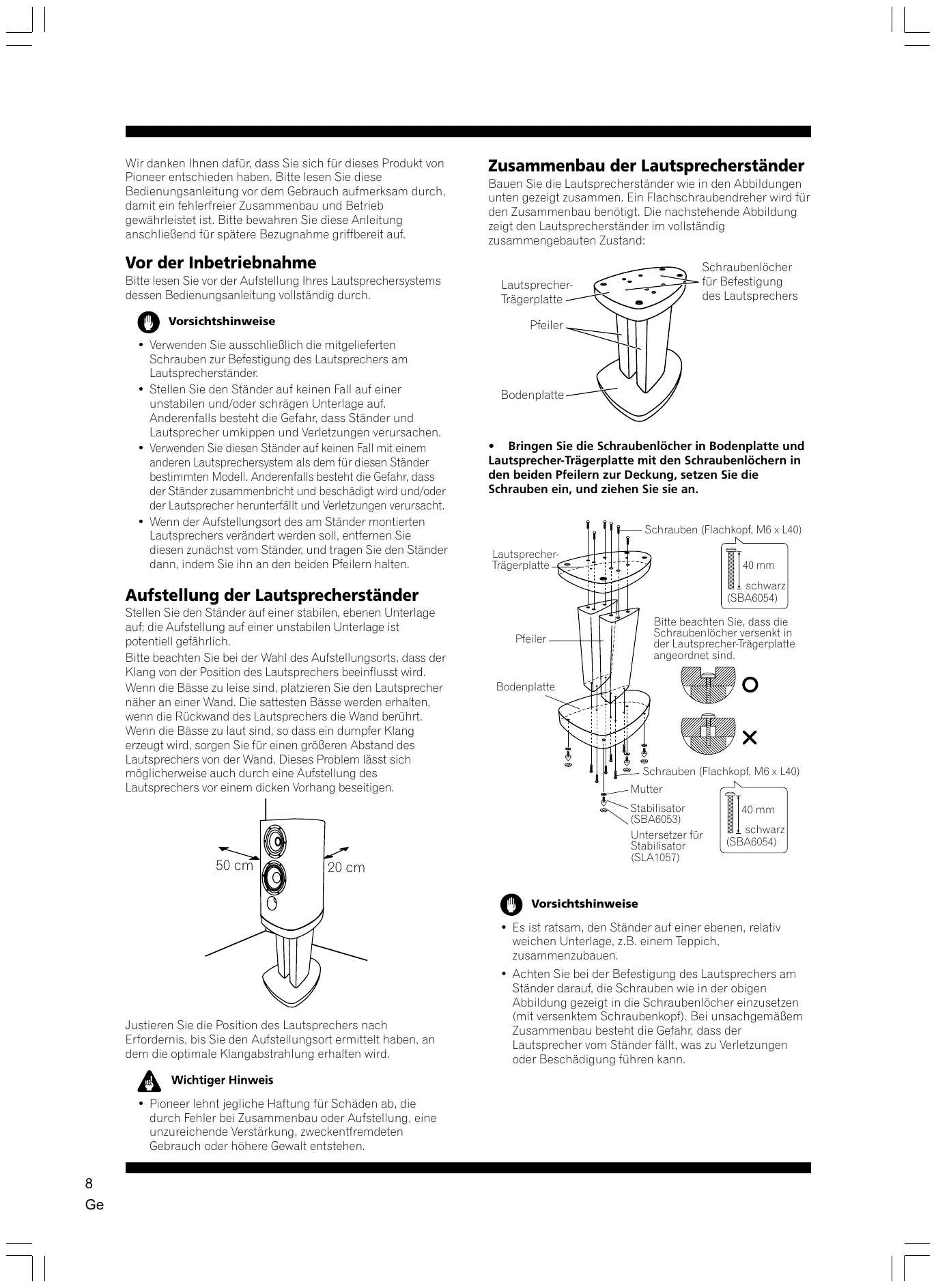 Aufstellung der Lautsprecherständer Stellen Sie den Ständer auf einer stabilen, ebenen Unterlage auf, die Aufstellung auf einer unstabilen Unterlage ist potentiel gefährlich