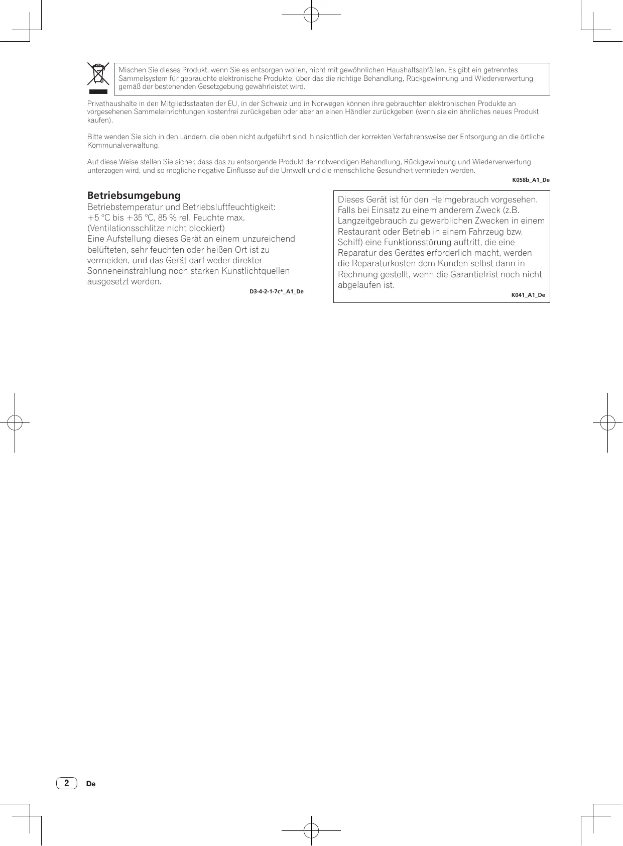 Mischen Sie dieses Produkt, wenn Sie es entsorgen wollen, nicht mit gewöhnlichen Haushaltsabfällen. Es gibt ein getrenntes Sammelsystem für gebrauchte elektronische Produkte, über das die richtige Behandlung, Rückgewinnung und Wiederverwertung gemäß der bestehenden Gesetzgebung gewährleistet wird. Privathaushalte in den Mitgliedsstaaten der EU, in der Schweiz und in Norwegen können ihre gebrauchten elektronischen Produkte an vorgesehenen Sammeleinrichtungen kostenfrei zurückgeben oder aber an einen Händler zurückgeben (wenn sie ein ähnliches neues Produkt kaufen). Bitte wenden Sie sich in den Ländern, die oben nicht aufgeführt sind, hinsichtlich der korrekten Verfahrensweise der Entsorgung an die örtliche Kommunalverwaltung. Auf diese Weise stellen Sie sicher, dass das zu entsorgende Produkt der notwendigen Behandlung, Rückgewinnung und Wiederverwertung unterzogen wird, und so mögliche negative Einflüsse auf die Umwelt und die menschliche Gesundheit vermieden werden. K058b_A1_De Betriebsumgebung Betriebstemperatur und Betriebsluftfeuchtigkeit: +5 °C bis +35 °C, 85 % rel. Feuchte max. (Ventilationsschlitze nicht blockiert) Eine Aufstellung dieses Gerät an einem unzureichend belüfteten, sehr feuchten oder heißen Ort ist zu vermeiden, und das Gerät darf weder direkter Sonneneinstrahlung noch starken Kunstlichtquellen ausgesetzt werden. D3-4-2-1-7c*_A1_De