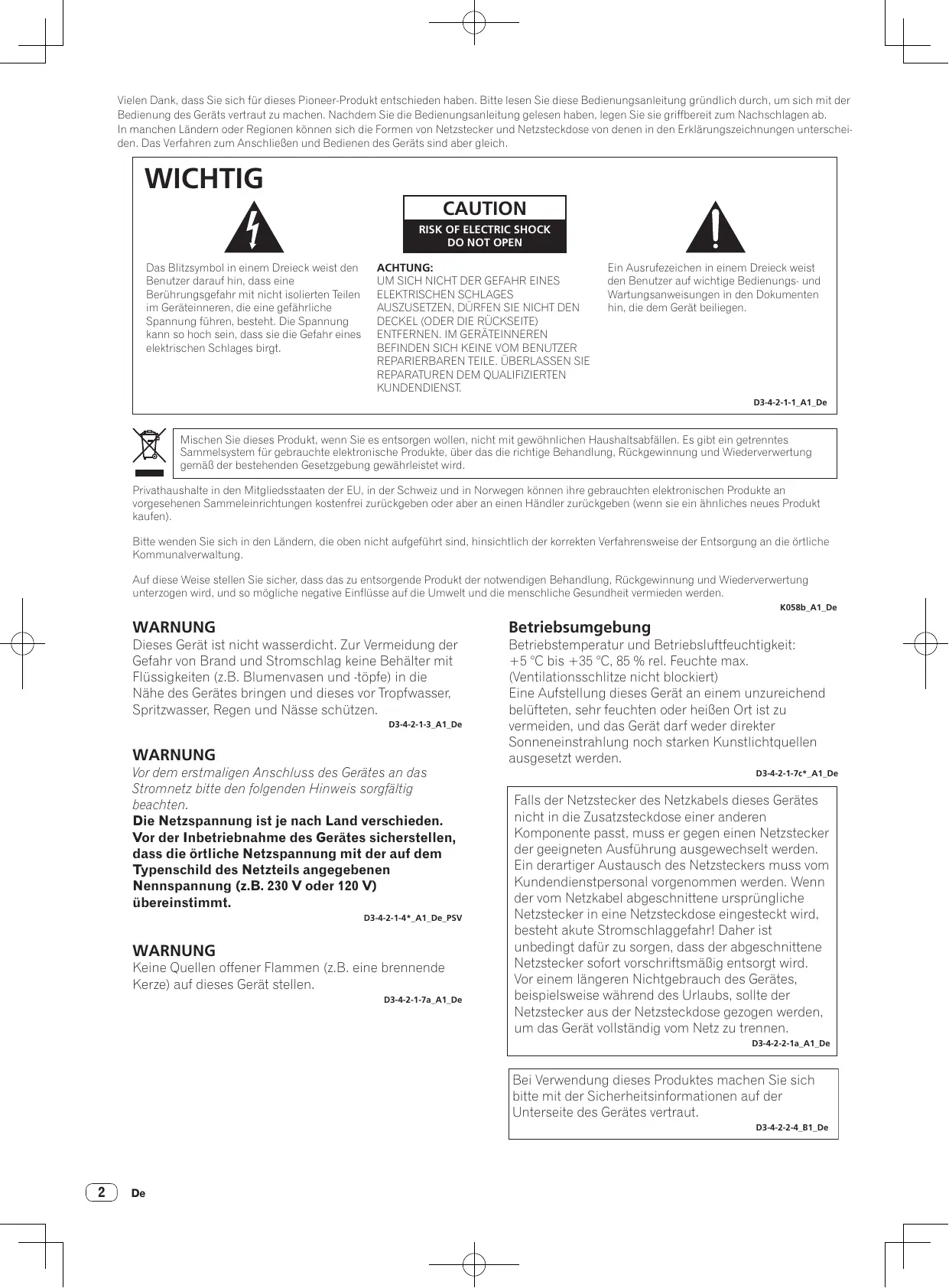 Vielen Dank, dass Sie sich für dieses Pioneer-Produkt entschieden haben. Bitte lesen Sie diese Bedienungsanleitung gründlich durch, um sich mit der Bedienung des Geräts vertraut zu machen. Nachdem Sie die Bedienungsanleitung gelesen haben, legen Sie sie griffbereit zum Nachschlagen ab. In manchen Ländern oder Regionen können sich die Formen von Netzstecker und Netzsteckdose von denen in den Erklärungszeichnungen unterscheiden. Das Verfahren zum Anschließen und Bedienen des Geräts sind aber gleich. WICHTIG CAUTION