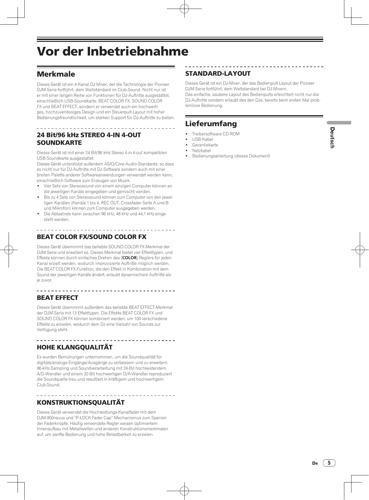 Vor der Inbetriebnahme Merkmale STANDARD-LAYOUT Dieses Gerät ist ein 4-Kanal DJ-Mixer, der die Technologie der Pioneer DJM-Serie fortführt, dem Weltstandard im Club-Sound. Nicht nur ist er mit einer langen Reihe von Funktionen für DJ-Auftritte ausgestattet, einschließlich USB-Soundkarte, BEAT COLOR FX, SOUND COLOR FX und BEAT EFFECT, sondern er verwendet auch ein hochwertiges, hochzuverlässiges Design und ein Steuerpult-Layout mit hoher Bedienungsfreundlichkeit, um starken Support für DJ-Auftritte zu bieten. Dieses Gerät ist ein DJ-Mixer, der das Bedienpult-Layout der Pioneer DJM-Serie fortführt, dem Weltstandard bei DJ-Mixern. Das einfache, saubere Layout des Bedienpults erleichtert nicht nur die DJ-Auftritte sondern erlaubt des den DJs, bereits beim ersten Mal problemlose Bedienung. Dieses Gerät ist mit einer 24 Bit/96 kHz Stereo 4-in 4-out kompatiblen USB-Soundkarte ausgestattet. Dieses Gerät unterstützt außerdem ASIO/Core Audio-Standards, so dass es nicht nur für DJ-Auftritte mit DJ-Software sondern auch mit einer breiten Palette anderer Softwareanwendungen verwendet werden kann, einschließlich Software zum Erzeugen von Musik. ! Vier Sets von Stereosound von einem einzigen Computer können an die jeweiligen Kanäle eingegeben und gemischt werden. ! Bis zu 4 Sets von Stereosound können zum Computer von den jeweiligen Kanälen (Kanäle 1 bis 4, REC OUT, Crossfader Seite A und B und Mikrofon) können zum Computer ausgegeben werden. ! Die Abtastrate kann zwischen 96 kHz, 48 kHz und 44,1 kHz eingestellt werden.