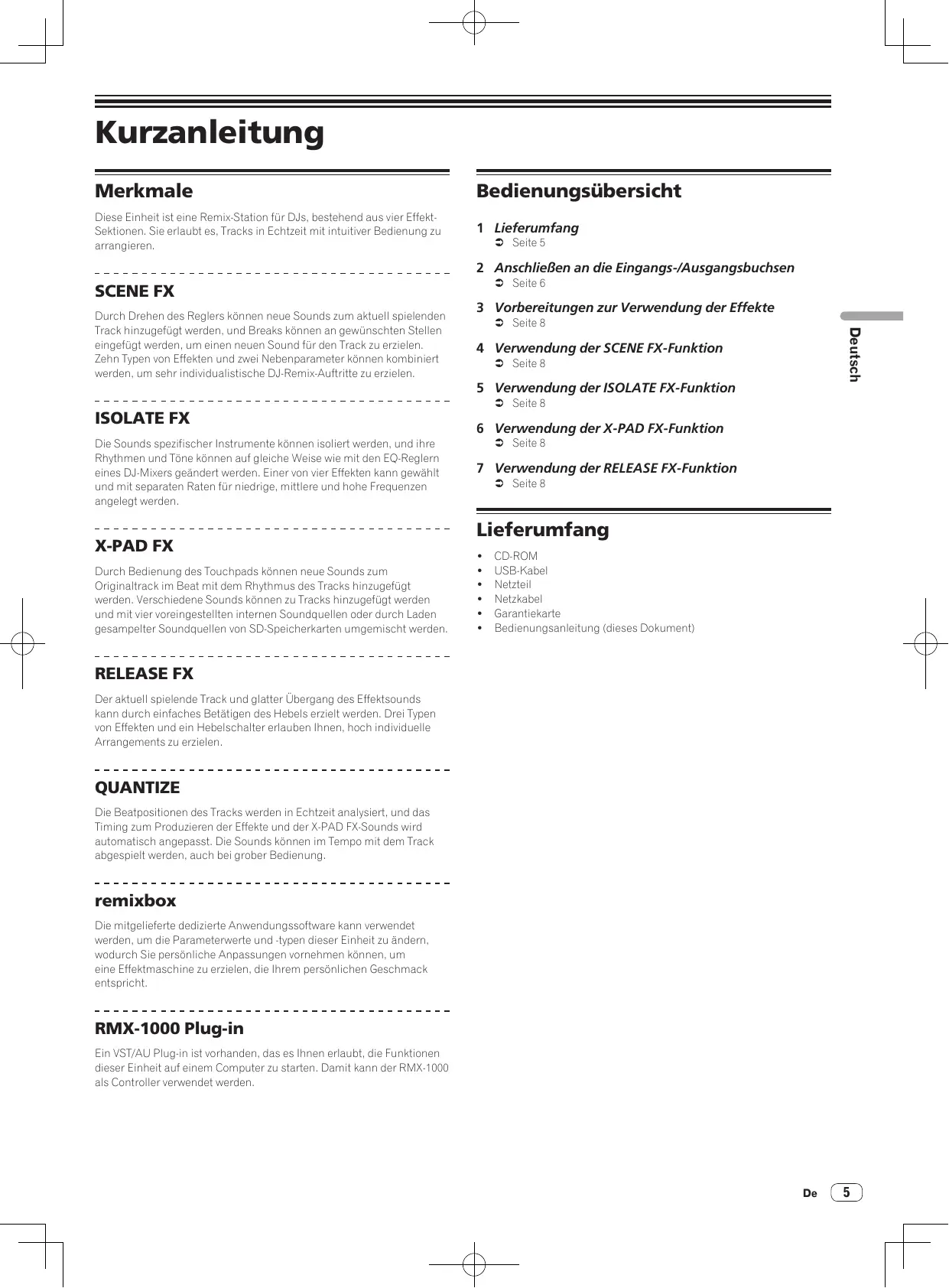CD-ROM USB-Kabel Netzteil Netzkabel Garantiekarte Bedienungsanleitung (dieses Dokument) RELEASE FX Der aktuell spielende Track und glatter Übergang des Effektsounds kann durch einfaches Betätigen des Hebels erzielt werden. Drei Typen von Effekten und ein Hebelschalter erlauben Ihnen, hoch individuelle Arrangements zu erzielen. QUANTIZE Die Beatpositionen des Tracks werden in Echtzeit analysiert, und das Timing zum Produzieren der Effekte und der X-PAD FX-Sounds wird automatisch angepasst. Die Sounds können im Tempo mit dem Track abgespielt werden, auch bei grober Bedienung. remixbox Die mitgelieferte dedizierte Anwendungssoftware kann verwendet werden, um die Parameterwerte und -typen dieser Einheit zu ändern, wodurch Sie persönliche Anpassungen vornehmen können, um eine Effektmaschine zu erzielen, die Ihrem persönlichen Geschmack entspricht. RMX-1000 Plug-in Ein VST/AU Plug-in ist vorhanden, das es Ihnen erlaubt, die Funktionen dieser Einheit auf einem Computer zu starten. Damit kann der RMX-1000 als Controller verwendet werden.