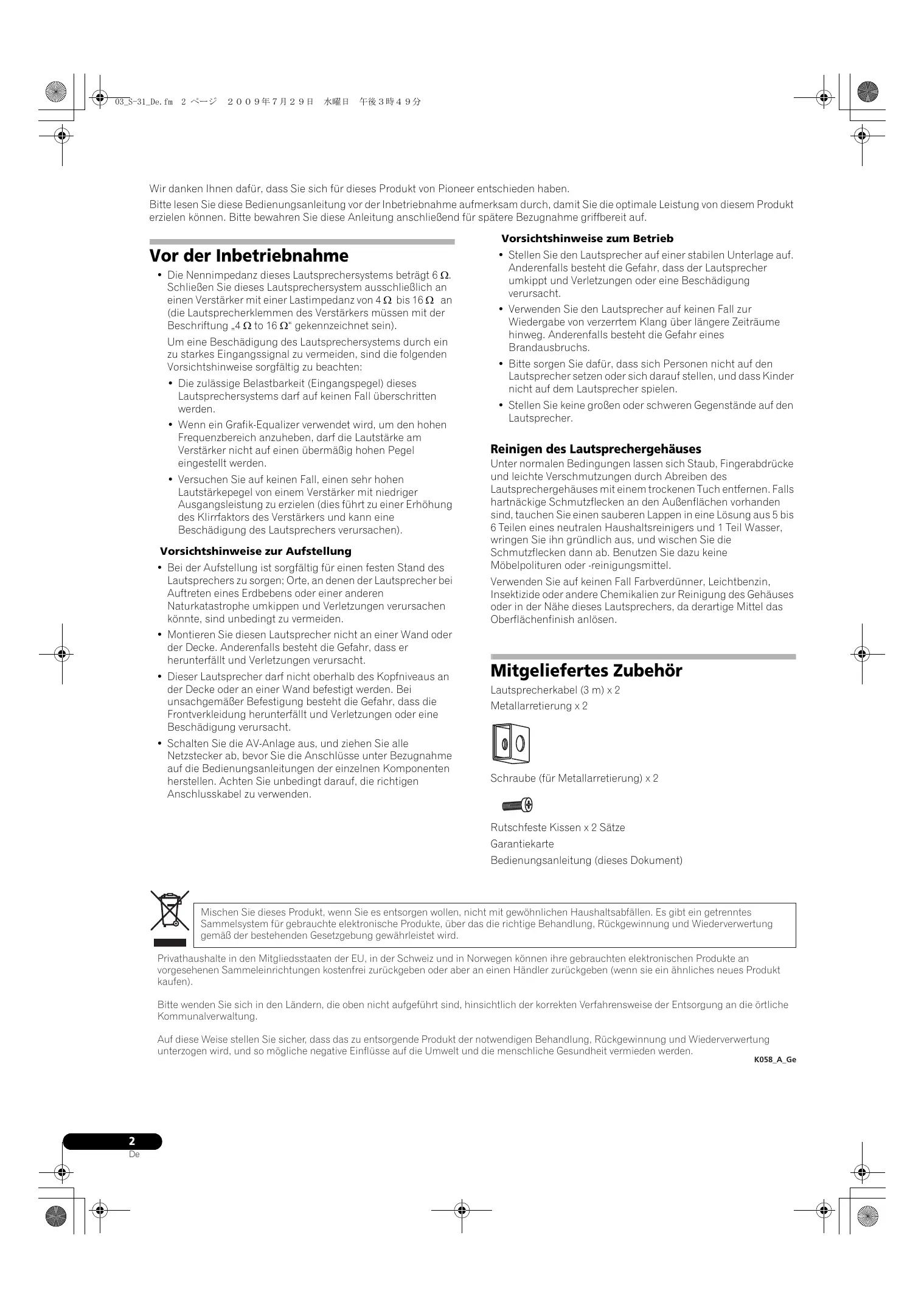 Wir danken Ihnen dafür, dass Sie sich für dieses Produkt von Pioneer entschieden haben. Bitte lesen Sie diese Bedienungsanleitung vor der Inbetriebnahme aufmerksam durch, damit Sie die optimale Leistung von diesem Produkt erzielen können. Bitte bewahren Sie diese Anleitung anschließend für spätere Bezugnahme griffbereit auf. Vorsichtshinweise zum Betrieb