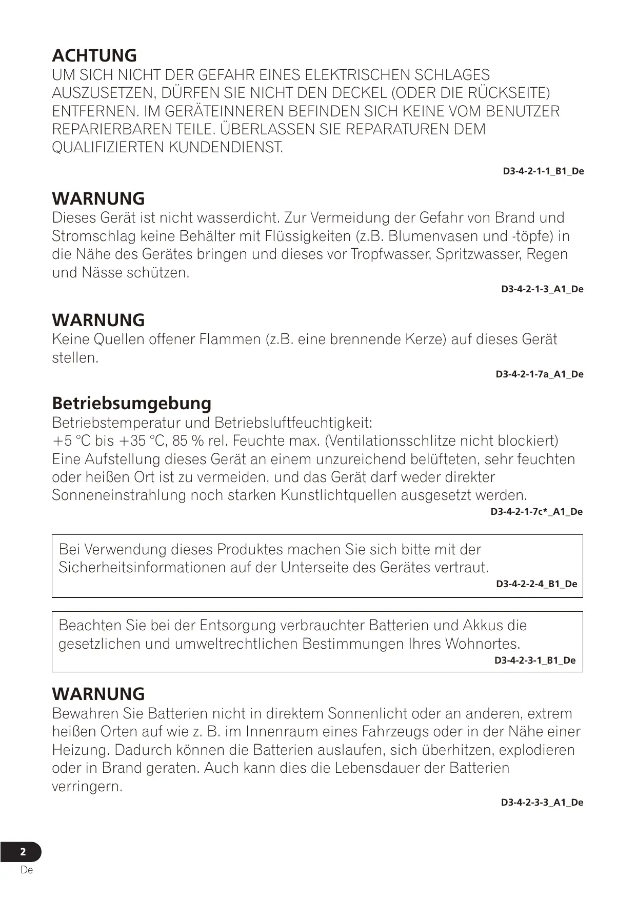 QUALIFIZIERTEN KUNDENDIENST. D3-4-2-1-1_B1_De WARNUNG Dieses Gerät ist nicht wasserdicht. Zur Vermeidung der Gefahr von Brand und Stromschlag keine Behälter mit Flüssigkeiten (z.B. Blumenvasen und -töpfe) in die Nähe des Gerätes bringen und dieses vor Tropfwasser, Spritzwasser, Regen und Nässe schützen. D3-4-2-1-3_A1_De WARNUNG Keine Quellen offener Flammen (z.B. eine brennende Kerze) auf dieses Gerät stellen. D3-4-2-1-7a_A1_De Betriebsumgebung Betriebstemperatur und Betriebsluftfeuchtigkeit: +5 °C bis +35 °C, 85 % rel. Feuchte max. (Ventilationsschlitze nicht blockiert) Eine Aufstellung dieses Gerät an einem unzureichend belüfteten, sehr feuchten oder heißen Ort ist zu vermeiden, und das Gerät darf weder direkter Sonneneinstrahlung noch starken Kunstlichtquellen ausgesetzt werden. D3-4-2-1-7c*_A1_De Bei Verwendung dieses Produktes machen Sie sich bitte mit der Sicherheitsinformationen auf der Unterseite des Gerätes vertraut. D3-4-2-2-4_B1_De Beachten Sie bei der Entsorgung verbrauchter Batterien und Akkus die gesetzlichen und umweltrechtlichen Bestimmungen Ihres Wohnortes. D3-4-2-3-1_B1_De WARNUNG Bewahren Sie Batterien nicht in direktem Sonnenlicht oder an anderen, extrem heißen Orten auf wie z. B. im Innenraum eines Fahrzeugs oder in der Nähe einer Heizung. Dadurch können die Batterien auslaufen, sich überhitzen, explodieren oder in Brand geraten. Auch kann dies die Lebensdauer der Batterien verringern. D3-4-2-3-3_A1_De