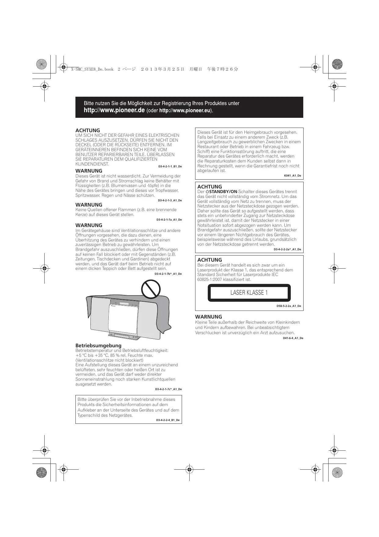 RP SIC SYXES De. book 2 — 2013#3A25H FMH Bitte nutzen Sie die Môglichkeit zur Registrierung Ihres Produktes unter http://www. pioneer. de (oder http:/www.pioneer.eu). ACHTUNG UM SICH NICHT DER GEFAHR EINES ELEKTRISCHEN SCHLAGES AUSZUSETZEN, DÜRFEN SIE NICHT DEN DECKEL (ODER DIE RÜCK ENTFERNEN. IM
