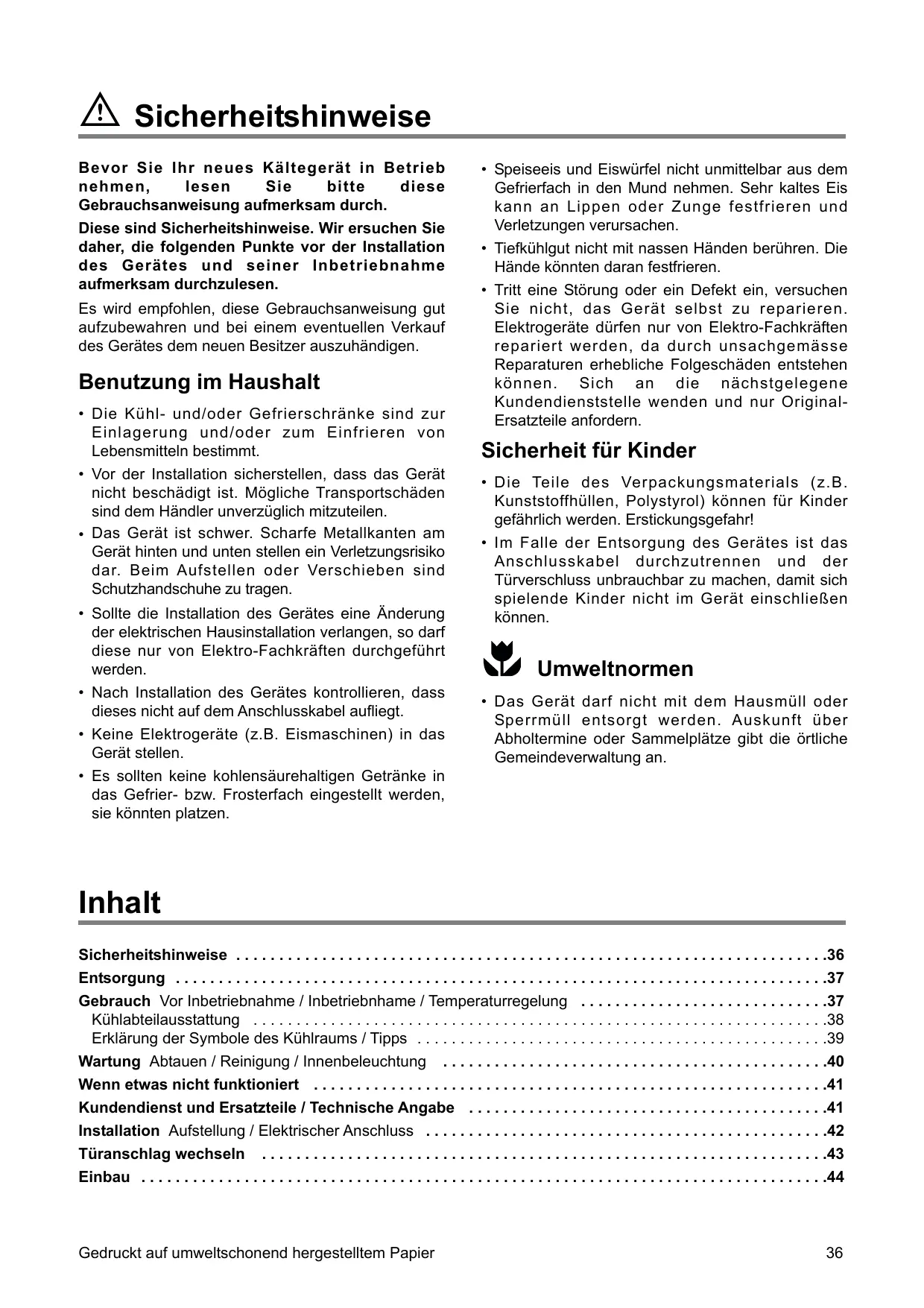 - Im Falle der Entsorgung des Gerätes ist das Anschlusskabel durchzutrennen und der Turverschluss unbrauchbar zu machen, damit sich spielende Kinder nicht im Gerät einschließlich konnen.