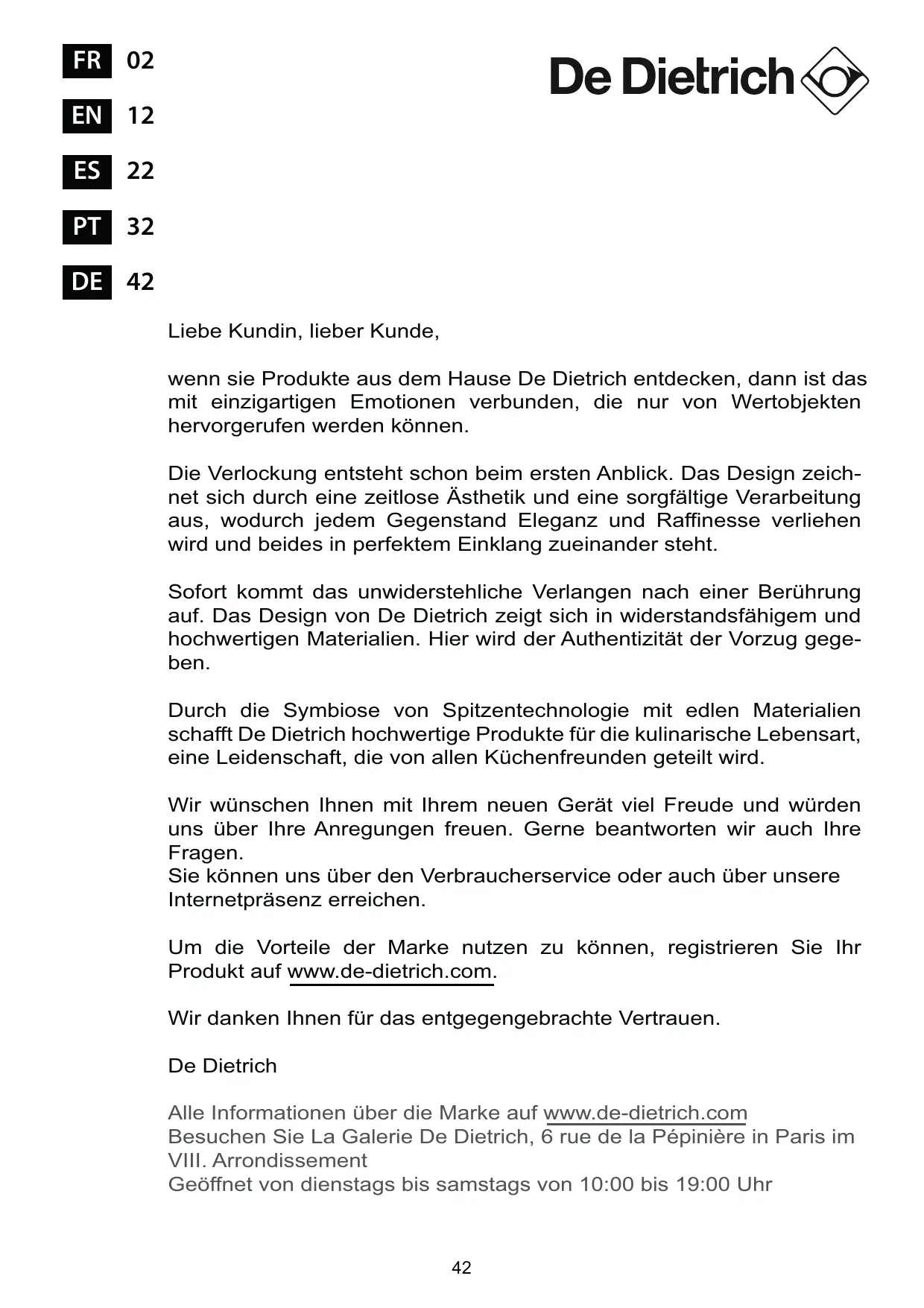 FR 02 EN 12 ES 22 PT 32 DE 42 Liebe Kundin, lieber Kunde, wenn sie Produkte aus dem Hause De Dietrich entdecken, dann ist das mit einzigartigen Emotionen verbunden, die nur von Wertobjekten hervorgerufen werden können. Die Verlockung entsteht schon beim ersten Anblick. Das Design zeichnet sich durch eine zeitlose Ästhetik und eine sorgfältige Verarbeitung aus, wodurch jedem Gegenstand Eleganz und Raffinesse verliehen wird und beides in perfektem Einklang zueinander steht. Sofort kommt das unwiderstehliche Verlangen nach einer Berührung auf. Das Design von De Dietrich zeigt sich in widerstandsfähigem und hochwertigen Materialien. Hier wird der Authentizität der Vorzug gegeben. Durch die Symbiose von Spitzentechnologie mit edlen Materialien schafft De Dietrich hochwertige Produkte für die kulinarische Lebensart, eine Leidenschaft, die von allen Küchenfreunden geteilt wird. Wir wünschen Ihnen mit Ihrem neuen Gerät viel Freude und würden uns über Ihre Anregungen freuen. Gerne beantworten wir auch Ihre Fragen. Sie können uns über den Verbraucherservice oder auch über unsere Internetpräsenz erreichen. Um die Vorteile der Marke nutzen zu können, registrieren Sie Ihr Produkt auf www.de-dietrich.com. Wir danken Ihnen für das entgegengebrachte Vertrauen. De Dietrich Alle Informationen über die Marke auf www.de-dietrich.com Besuchen Sie La Galerie De Dietrich, 6 rue de la Pépinière in Paris im
