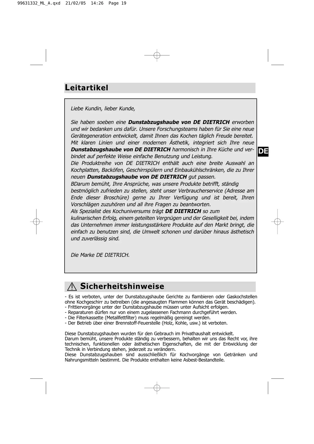 Sie haben sogeben eine Dunstabzugshaube von DE DIETRICH erworben und wir bedanken uns davon. Itsere Forschungsteams haben fur Sie eine neue Gerätegeneration entwickelt, damit Ihnen das Kochen tätig Freude bereitet. Mit klaren Linien und einer modernen Ästhetik, integriert sich ihre neue Dunstabzugshaube von DE DIETRICH harmonisch in ihre Küche und verbindet auf perfekte Weise einfache Benutzung und Leistung.