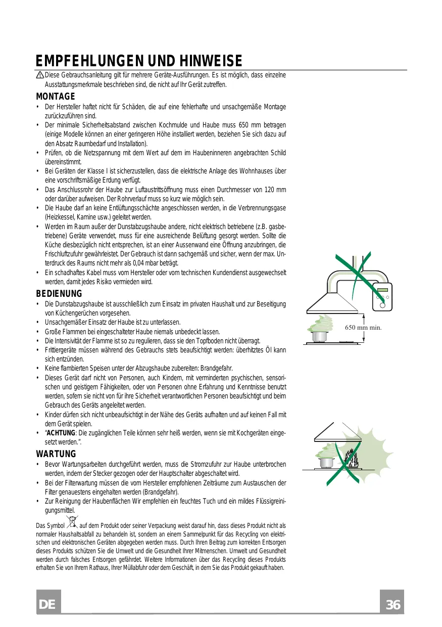 - Keine flambierten Speisen unter der Abzugshaube zubereiten: Brandgefahr.
