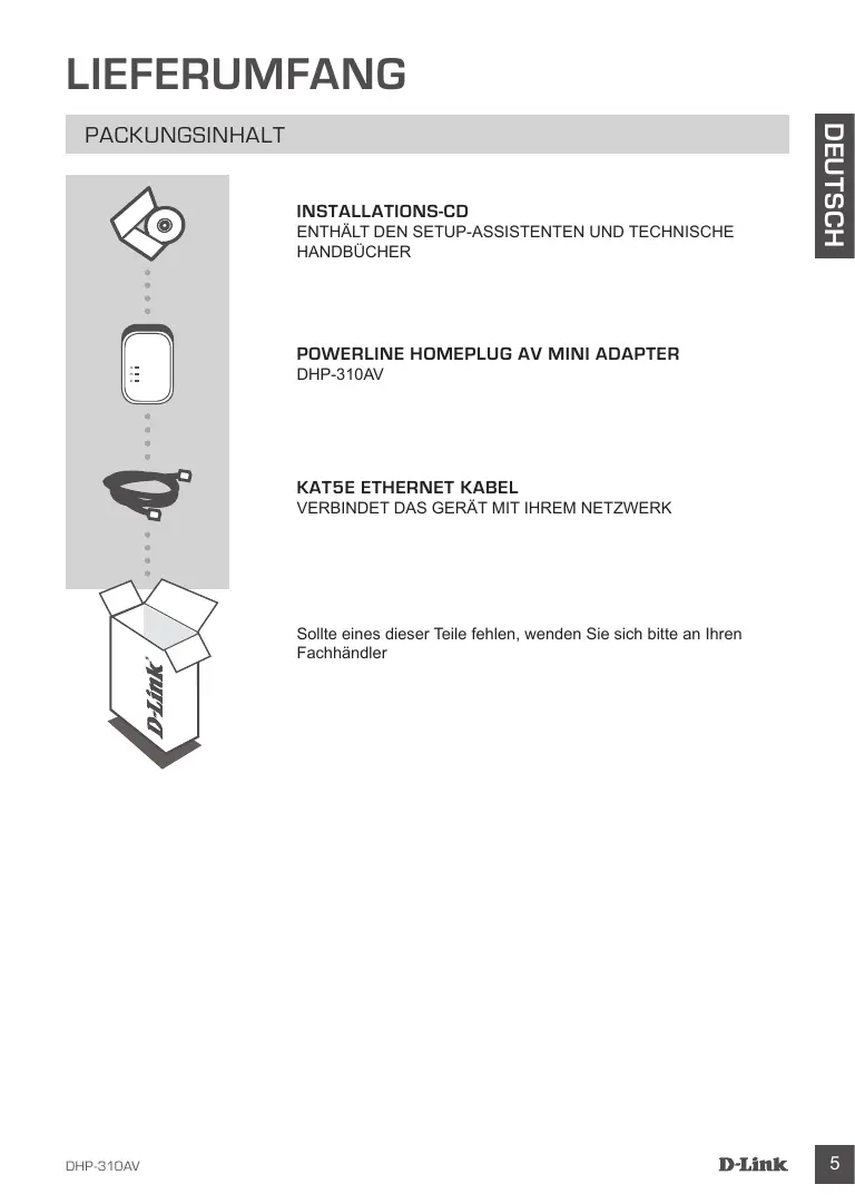VERBINDET DAS GERÄT MIT IHREM NETZWERK Sollte eines dieser Teile fehlen, wenden Sie sich bitte an Ihren Fachhändler DHP-310AV
