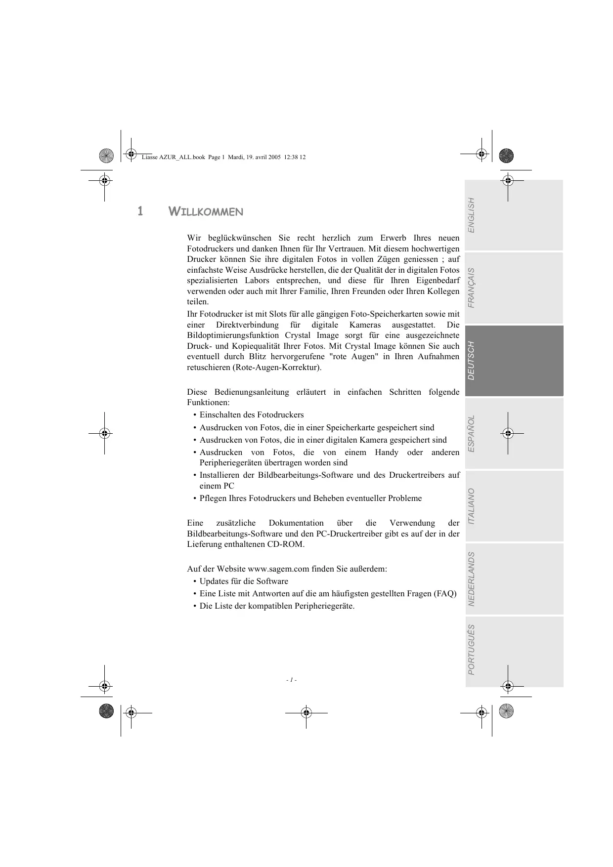 T ÿ 1 WILLKOMMEN Ê ë Wir beglückwünschen Sie recht herzlich zum Erwerb Ihres neuen Fotodruckers und danken Ihnen für Ihr Vertrauen. Mit diesem hochwertigen Drucker kônnen Sie ihre digitalen Fotos in vollen Zügen geniessen ; auf cinfachste Weise Ausdrücke herstellen, die der Qualität der in digitalen Fotos 4 spezialisierten Labors entsprechen, und diese für Ihren Eigenbedarf 5, verwenden oder auch mit Ihrer Familie, Ihren Freunden oder Ihren Kollegen Z teilen. Fa Ihr Fotodrucker ist mit Slots für alle gängigen Foto-Speicherkarten sowie mit einer Direktverbindung für digitale Kameras ausgestattet. Die Bildoptimierungsfunktion Crystal Image sorgt für eine ausgezeichnete Druck- und Kopiequalität Ihrer Fotos. Mit Crystal Image kônnen Sie auch ES eventuell durch Blitz hervorgerufene "rote Augen" in Ihren Aufnahmen Ÿ2 retuschieren (Rote-Augen-Korrektur). à Q Diese Bedienungsanleitung erläutert in einfachen Schritten folgende Funktionen: + Einschalten des Fotodruckers , © + Ausdrucken von Fotos, die in einer Speicherkarte gespeichert sind z + Ausdrucken von Fotos, die in einer digitalen Kamera gespeichert sind © + Ausdrucken von Fotos, die von einem Handy oder anderen Peripheriegeräten übertragen worden sind + Installieren der Bildbearbeitungs-Software und des Druckertreibers auf einem PC o + Pflegen Ihres Fotodruckers und Beheben eventueller Probleme É à Eine zusätzliche Dokumentation über die Verwendung der = Bildbearbeitungs-Software und den PC-Druckertreiber gibt es auf der in der Lieferung enthaltenen CD-ROM. o Q Auf der Website www.sagem.com finden Sie auferdem: = + Updates für die Software ÈË + Eine Liste mit Antworten auf die am häufigsten gesteliten Fragen (FAQ) © + Die Liste der kompatiblen Peripheriegeräte. z a 4 =] © > È œ Le] a