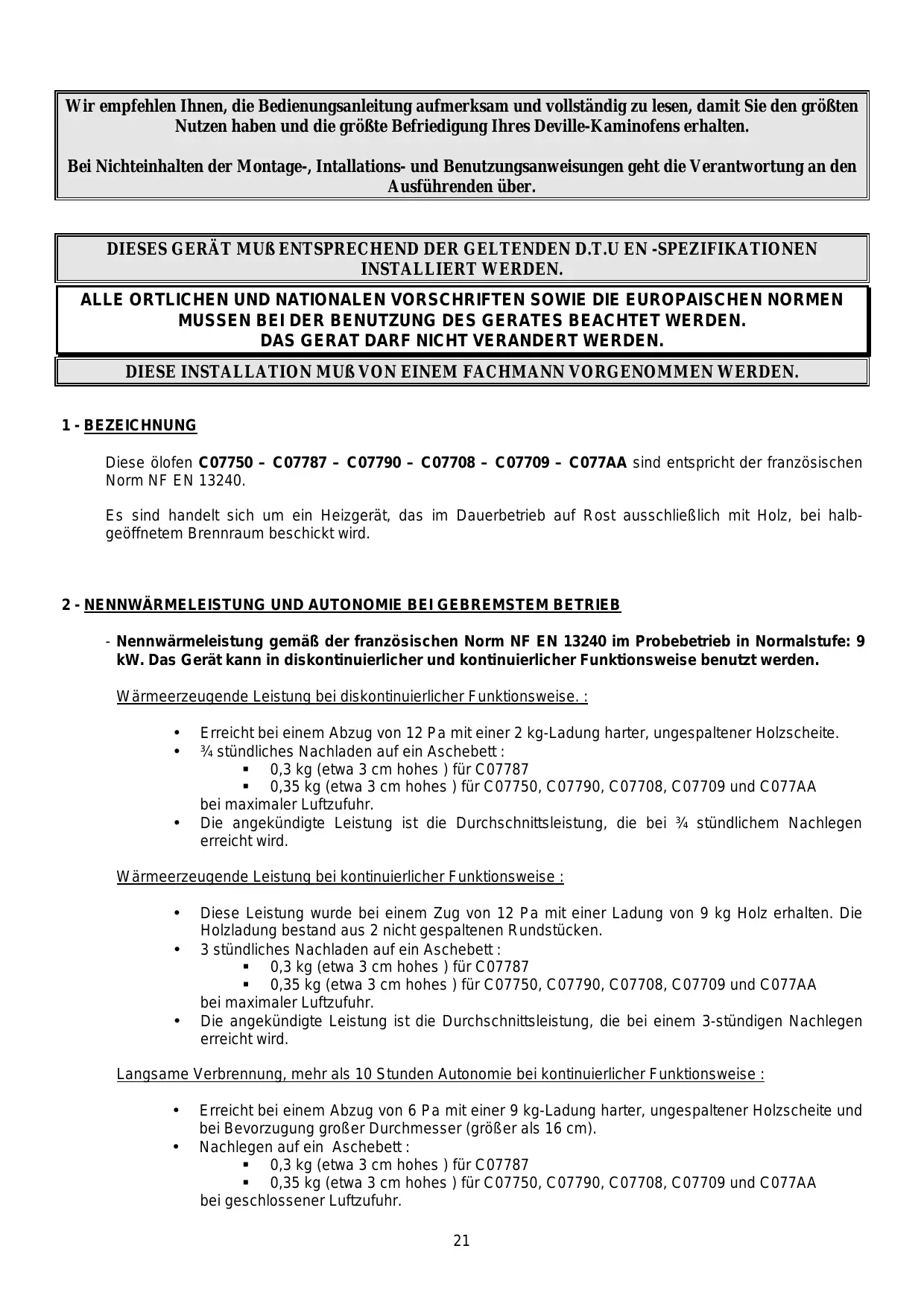 Wir empfehlen Ihnen, die Bedienungsanleitung aufmerksam und vollständig zu lesen, damit Sie den größten Nutzen haben und die größte Befriedigung Ihres Deville-Kaminofens erhalten. Bei Nichteinhalten der Montage-, Intallations- und Benutzungsanweisungen geht die Verantwortung an den Ausführenden über. DIESES GERÄT MUß ENTSPRECHEND DER GELTENDEN D.T.U EN -SPEZIFIKATIONEN INSTALLIERT WERDEN. ALLE ORTLICHEN UND NATIONALEN VORSCHRIFTEN SOWIE DIE EUROPAISCHEN NORMEN MUSSEN BEI DER BENUTZUNG DES GERATES BEACHTET WERDEN. DAS GERAT DARF NICHT VERANDERT WERDEN. DIESE INSTALLATION MUß VON EINEM FACHMANN VORGENOMMEN WERDEN.